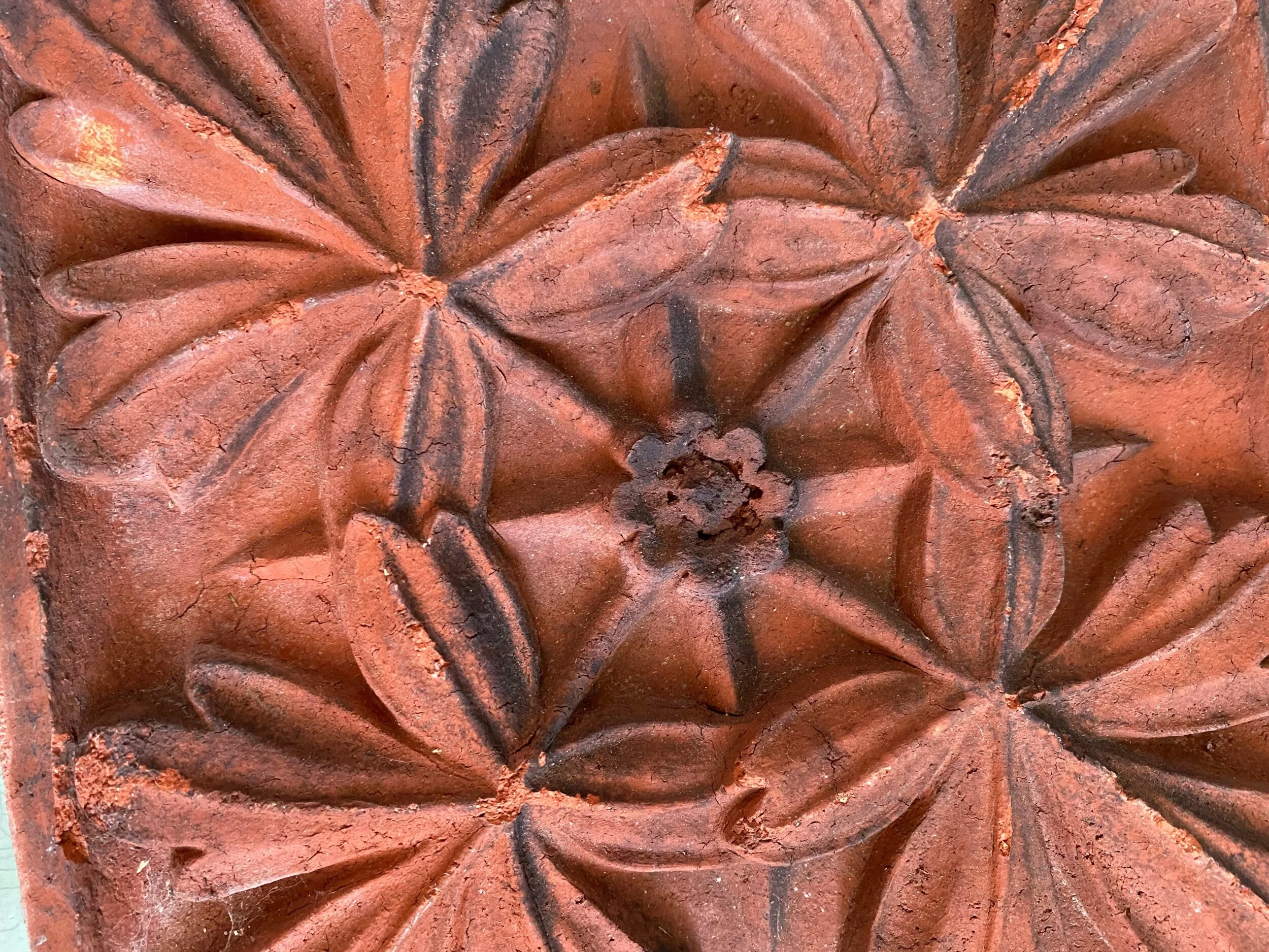 Old (we think) red brick tile with ornate raised floral pattern. Retrofitted on the reverse with a wire and screws for hanging. The brick is quite heavy and the wire is sturdy enough to hang- someone knew what they were doing. This would make such an interesting and unique focal-point in any space. A unique and interesting way to add texture and depth to any decor scheme. Price includes one brick.