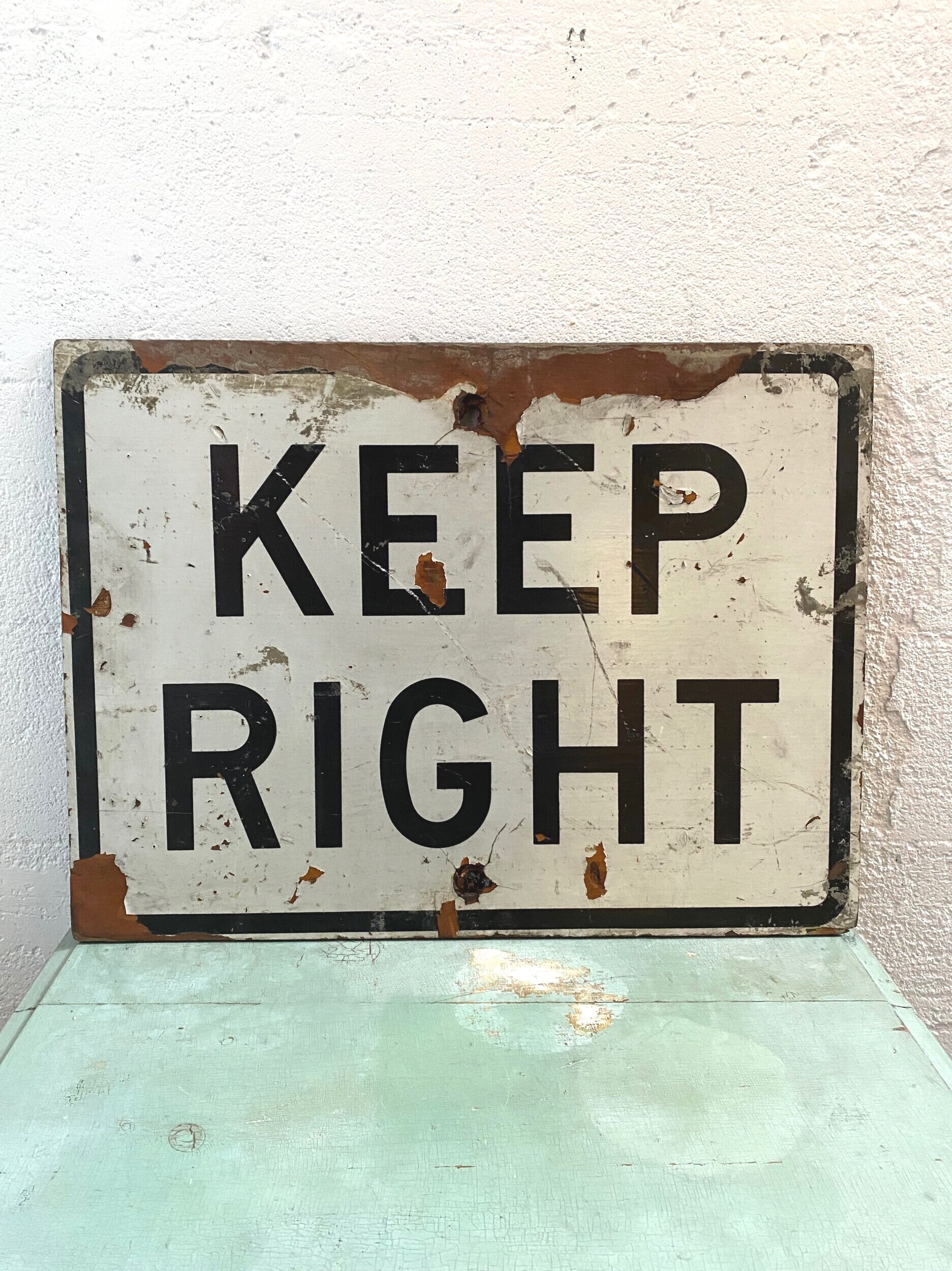 Vintage, decommissioned, “keep right” street sign. Significant wear, which reinforces that industrial vibe. This could mix well with any deco- so many possibilities! There is a hole on the top and bottom, which will make it easy to wall-mount.