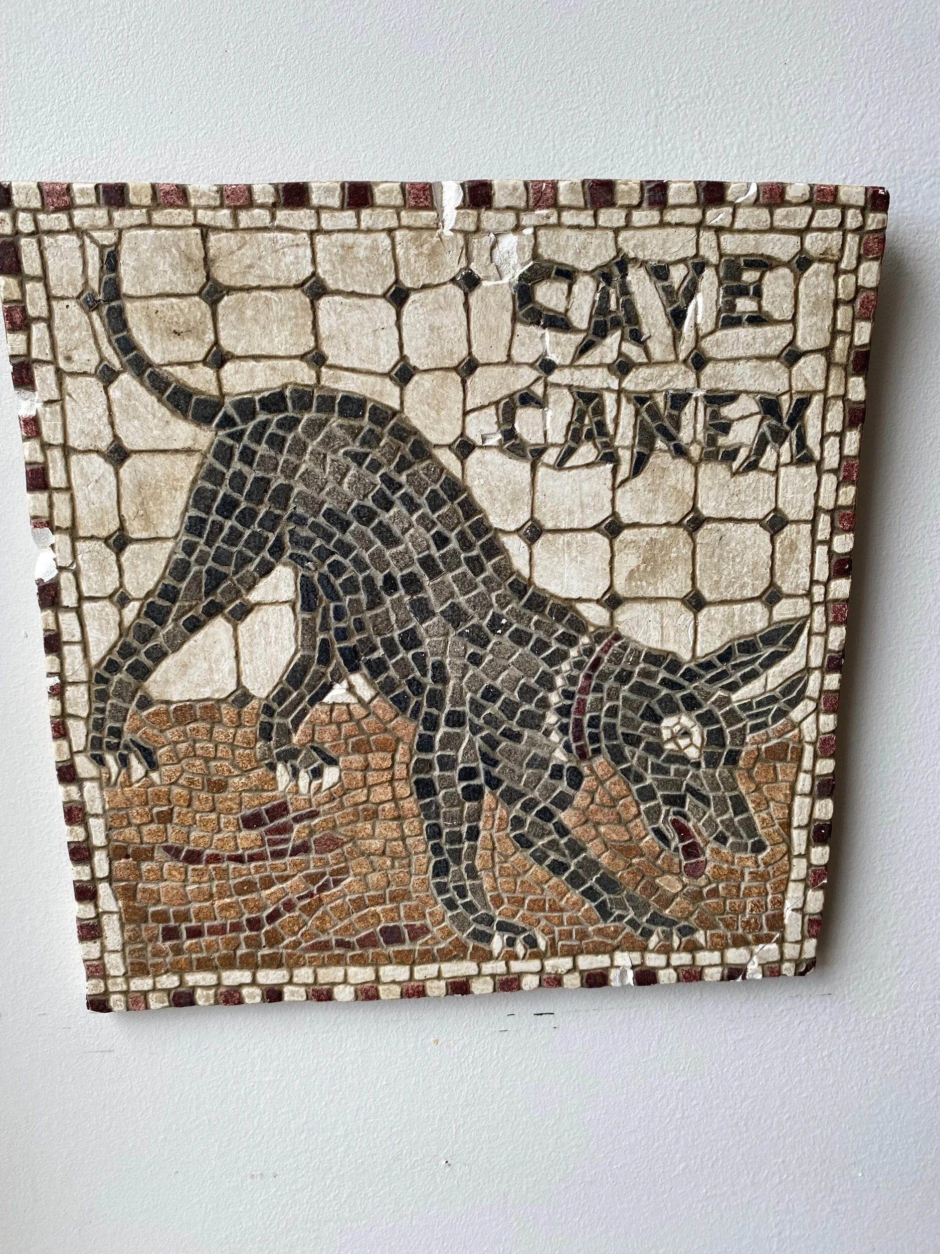 Someone brought this special piece back from Rome. Very cool mosaic design with a ‘“ferocious” looking dog and “Cave Canem (which means “beware the dog” in Latin. Signed on the back with “Roma” and MMI (2001). Metal hook on the back means it’s ready to mount. There is some expected wear, including a break in the bottom right corner, as pictured.