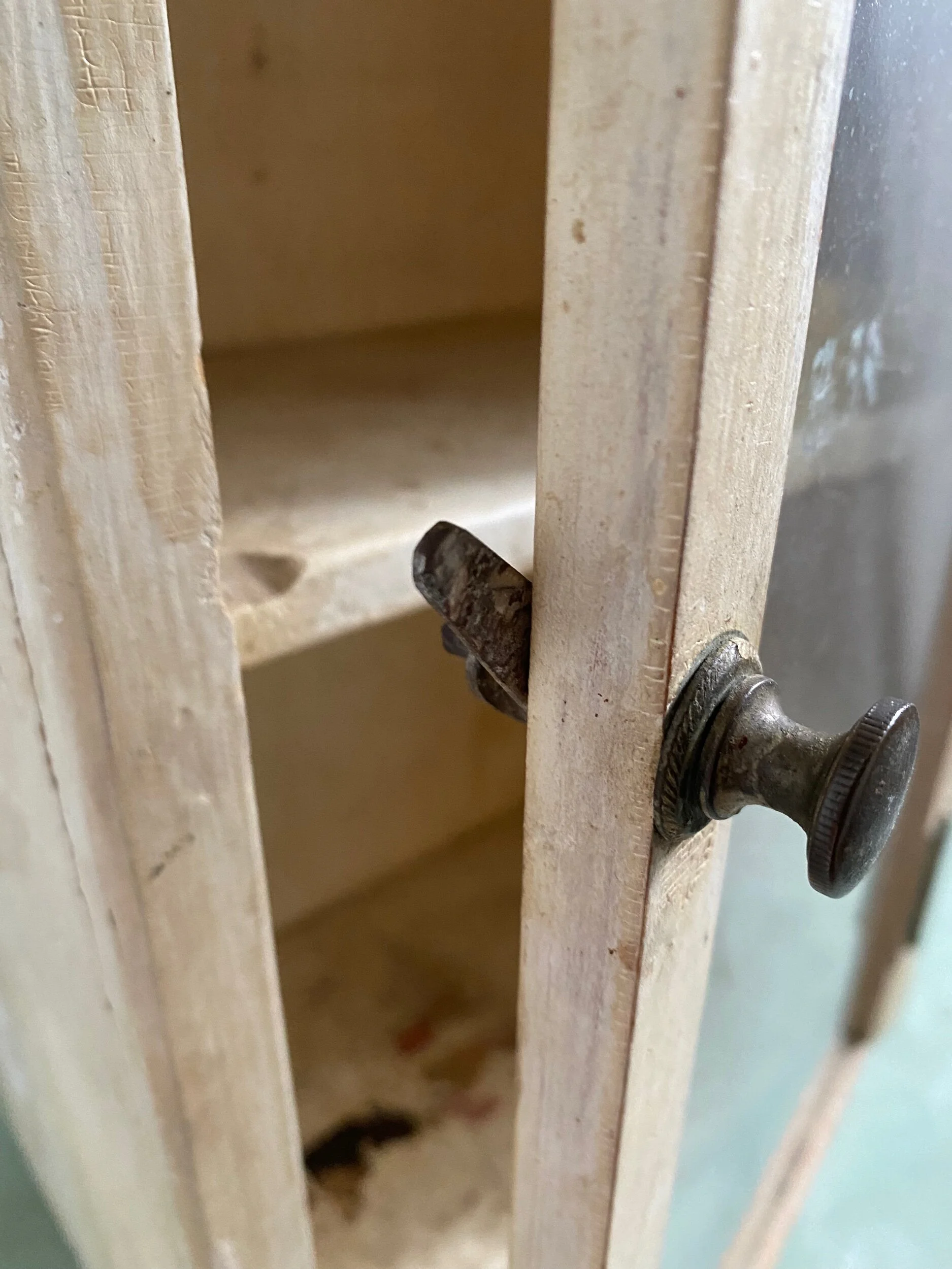 A unique antique apothecary cabinet, ready to mount on your wall. This is in good condition, with the sweetest little metal clasp/closure. Off-white hue with a distressed look. This piece would be great for creating depth and texture on a gallery wall, hung in a bathroom to store various tinctures, or set atop a bookcase or table. Very sweet and very unique.