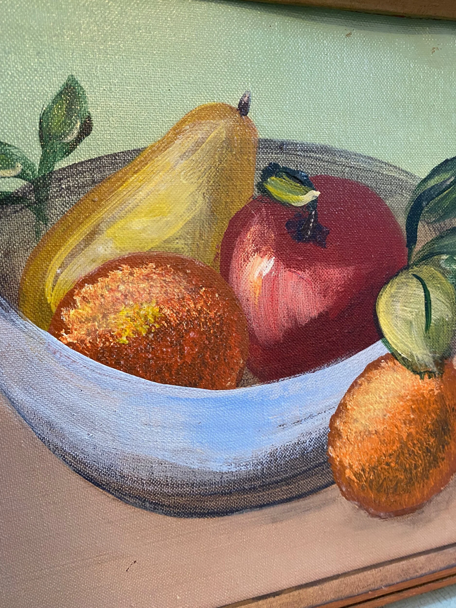 Original handpainted oil on board of a bowl with pear, apples, and oranges in a vintage wooden frame. The colors of the fruit are vibrant against the light green and brown background. This would be beautiful hung in a kitchen or eatery. There is some minor wear on the right hand side, along the edge, as pictured. Unsigned.
