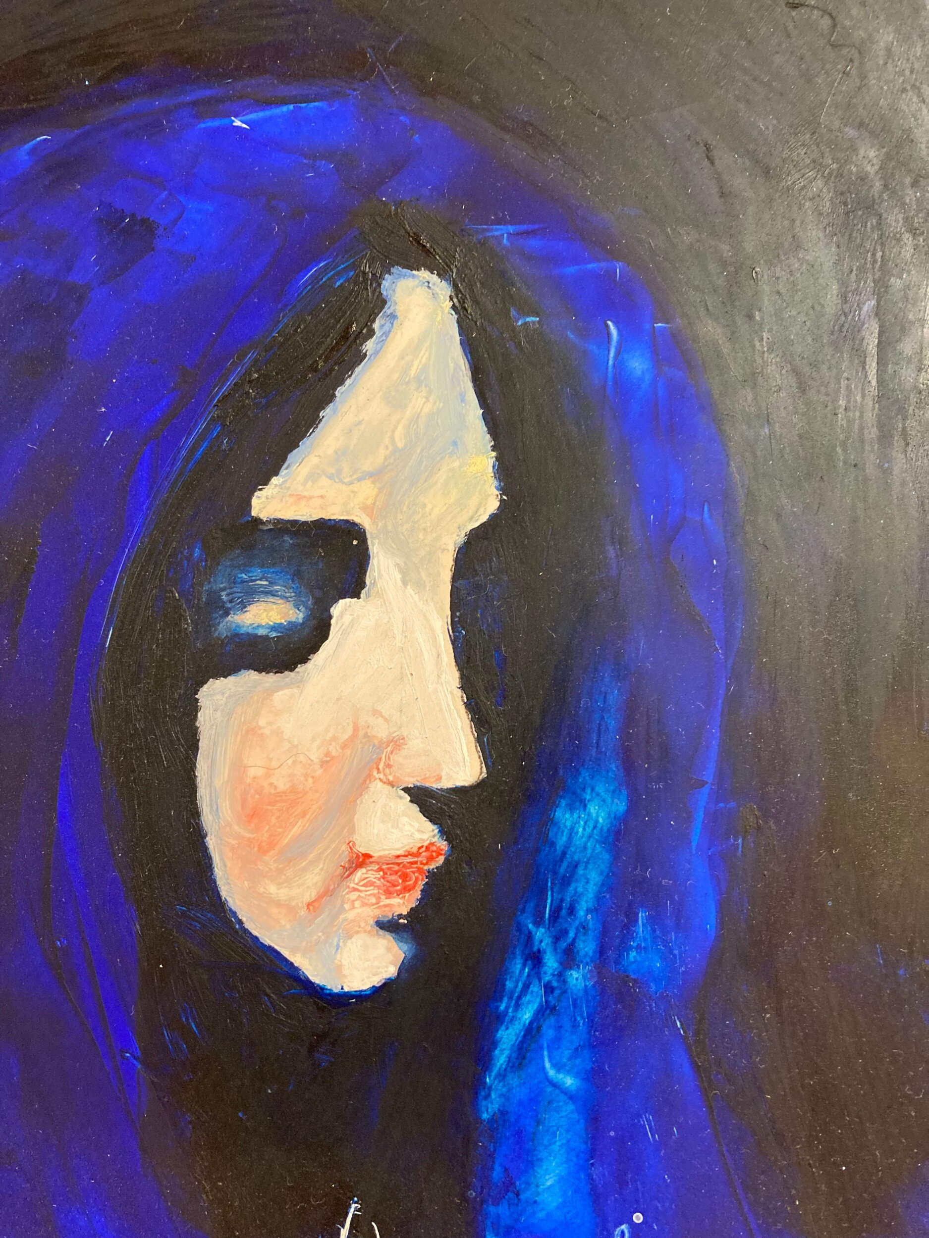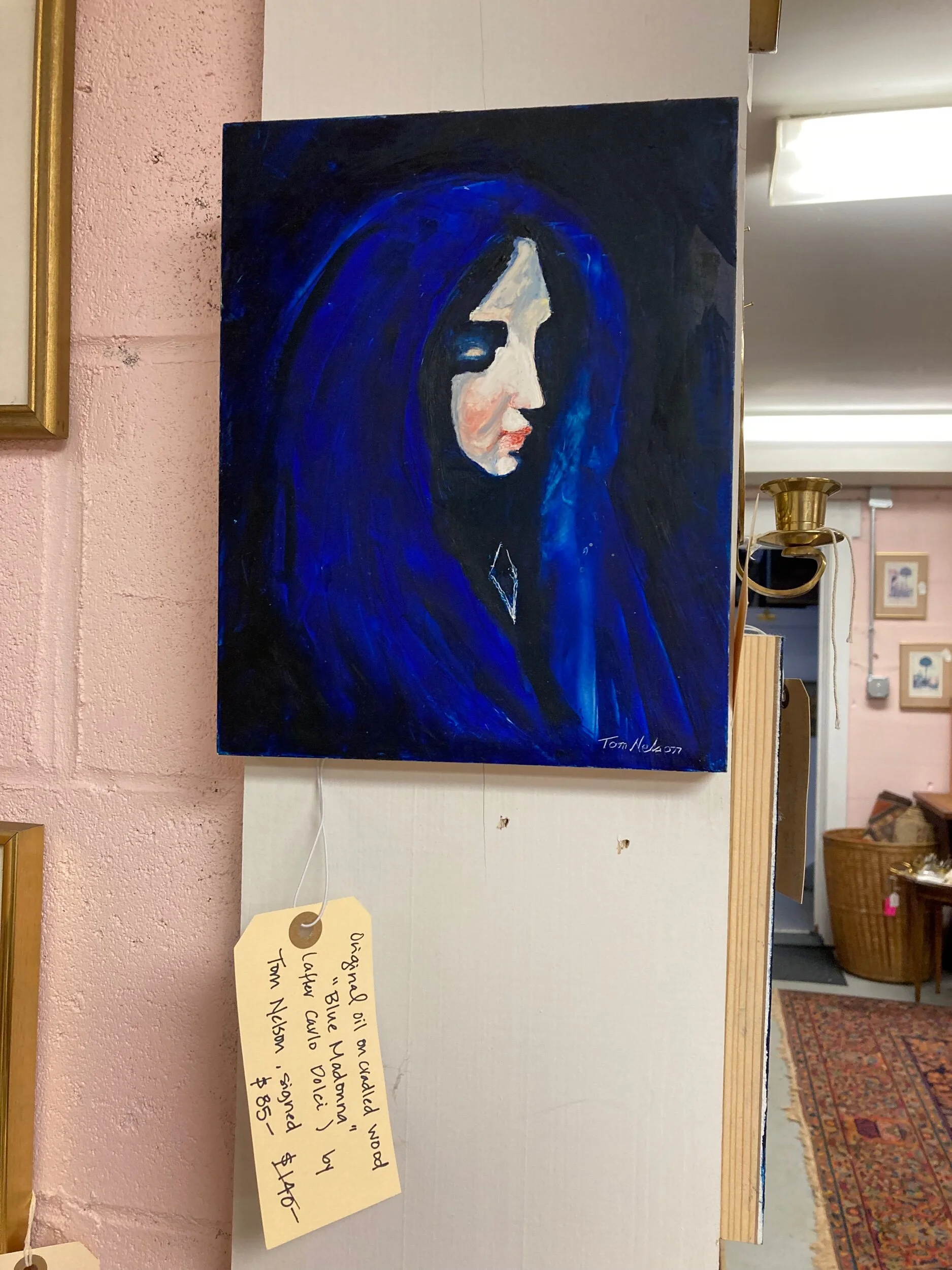 Original oil on cradled wood panel by Maine-based artist, Tom Nelson (1949- ). In the likeness of “Blue Madonna” by Carlo Dolci. This piece is quite striking, with a vibrant blue that draws in the eye- a definite conversation piece! Signed by the artist.