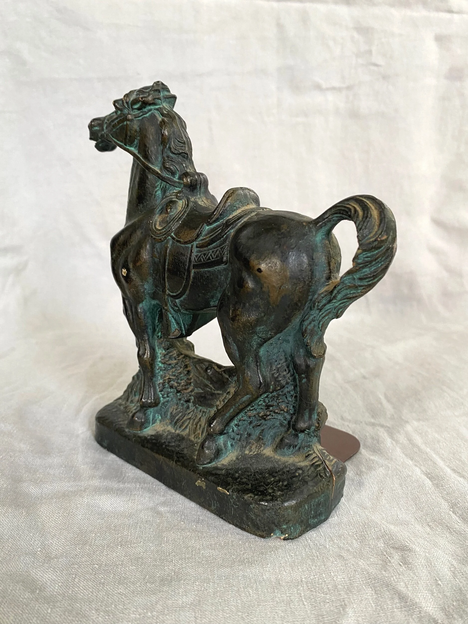 Manufactured by the iconic Syroco and made of wood pulp, molded into the likeness of a horse. Lightweight, but with the appearance of bronze with verdigris patina. A previous owner glued an extension to the base, designed to slide underneath a book for stability and with a cork bottom, to protect surfaces. Both extend to the left, so they could be separated along a shelf, the extensions could be removed, or one horse could face “forward” and the other “backward.” Excellent vintage condition.