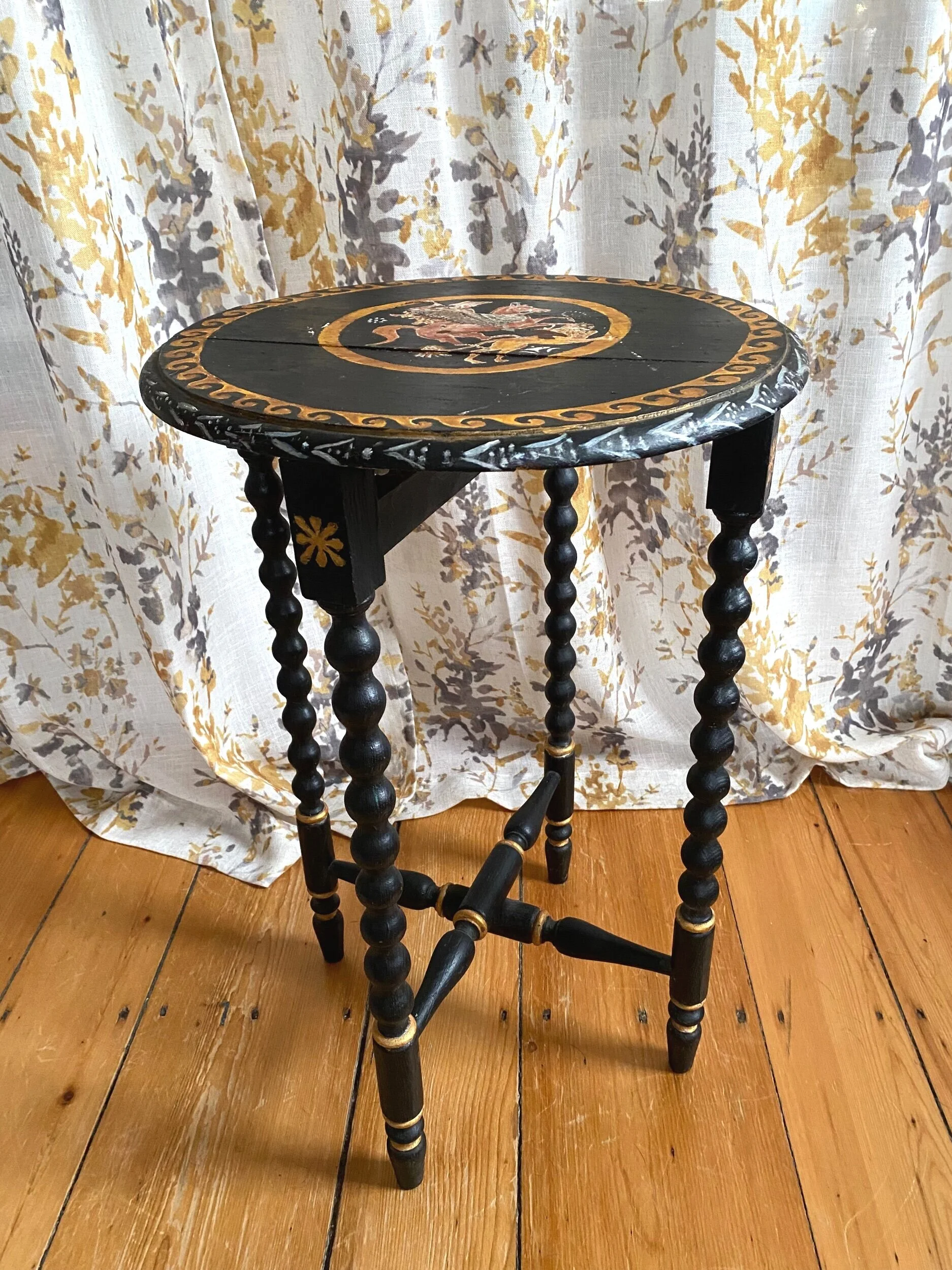 This is one of a kind! Beautiful handpainted detail on the table-top depicts Bellerophon riding Pegasus and slaying the Chimera in gold, salmon, blue and white mixed hues. Bobbin legs tangle into each other and the round table-top folds on each side (see photo with hinges displayed) for easy storage and moving. Very interesting and unusual design. This is in great vintage condition with some wear on the table and painted areas, as is to be expected. We love this as a side or entryway table.