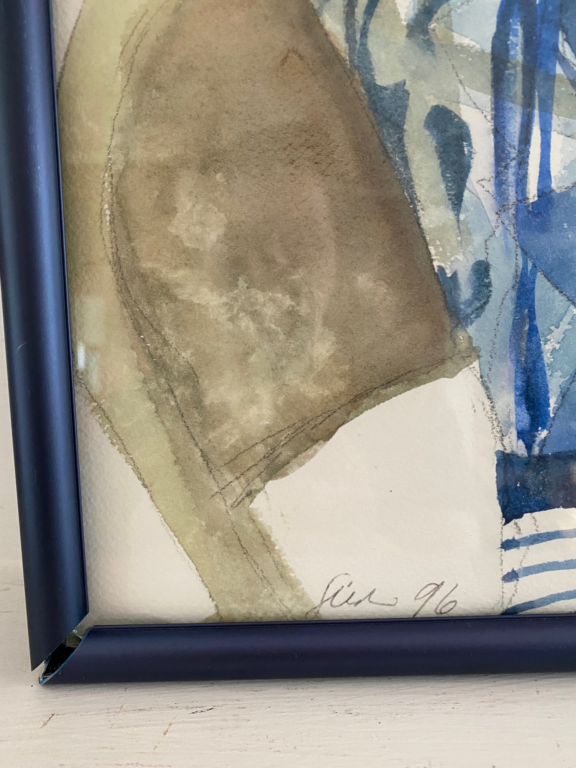 An absolutely stunning original art piece. This watercolor and pencil portrait features a human, in profile seated upon a chair, with beautiful and soothing blue, periwinkle, brown, cream, and cobalt hues. The frame is a dark blue/grey and made of metal. As pictured, there is some minor damage to the bottom left corner of the frame and the glass. A collector may wish to replace the frame at some point t, as it’s dated, but that can come wily time. It’s a beautiful piece, as is. The art piece is fully in-tact. It is signed “Liu ‘96.”