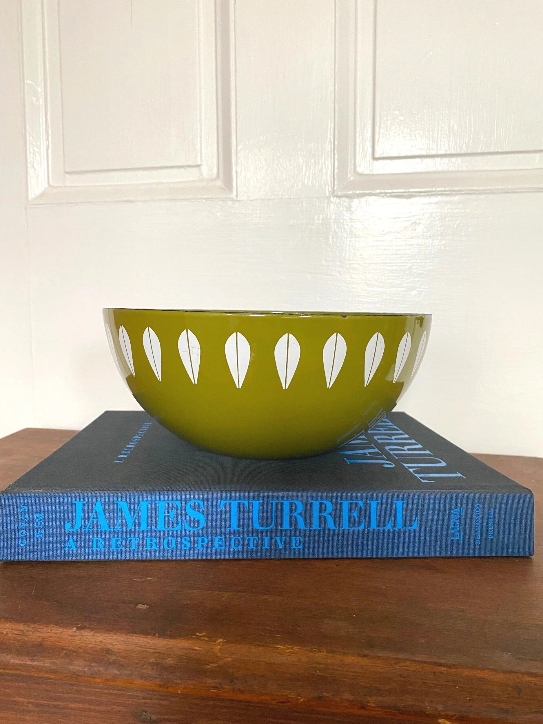Iconic and highly collectible Catherineholm of Norway enamel “lotus” bowl (circa 1950). Olive green hue with white lotus design. Signature on the base is still visible. Great vintage condition, with some minor wear along rim and scuffing on base, as pictured.