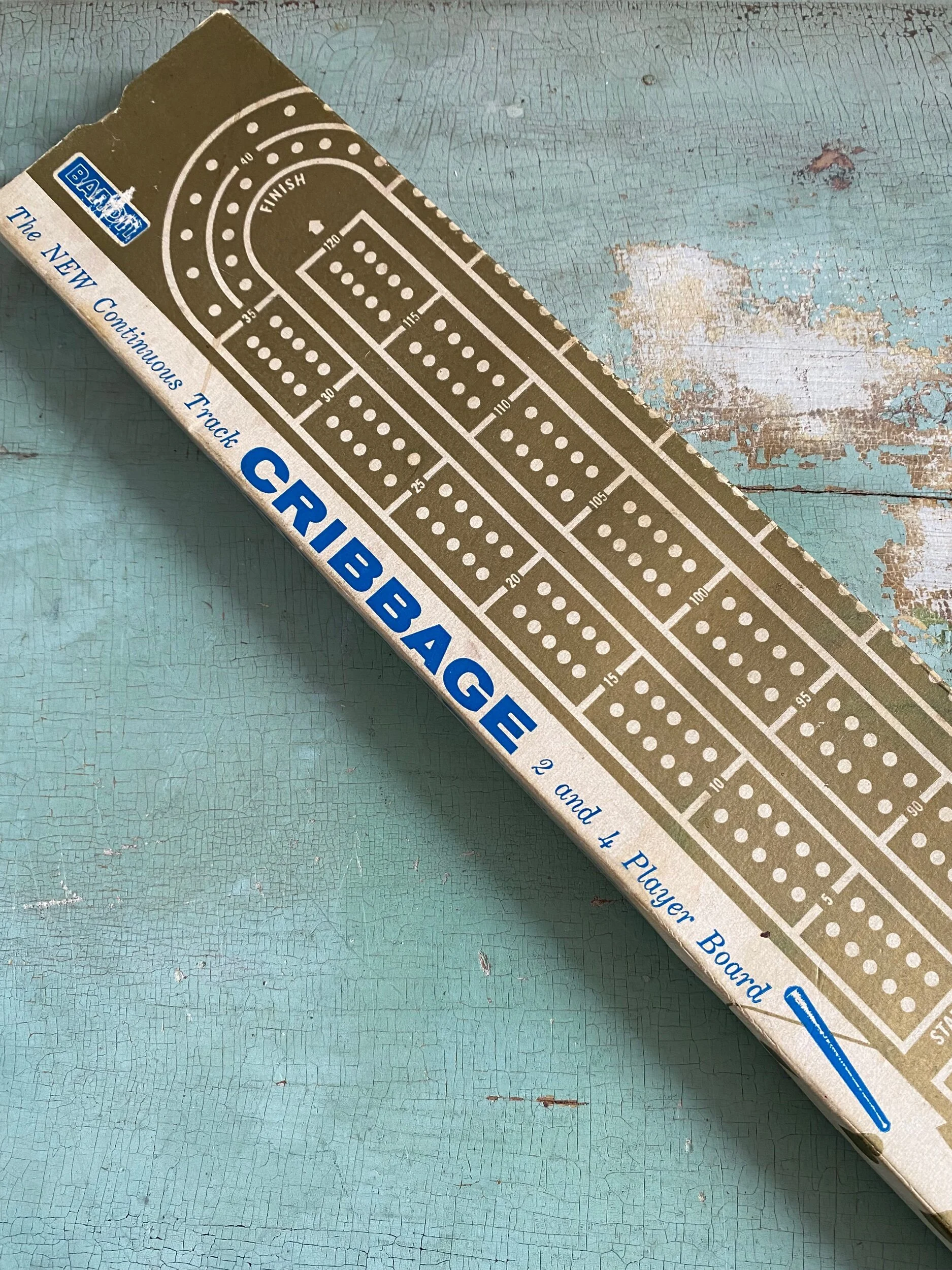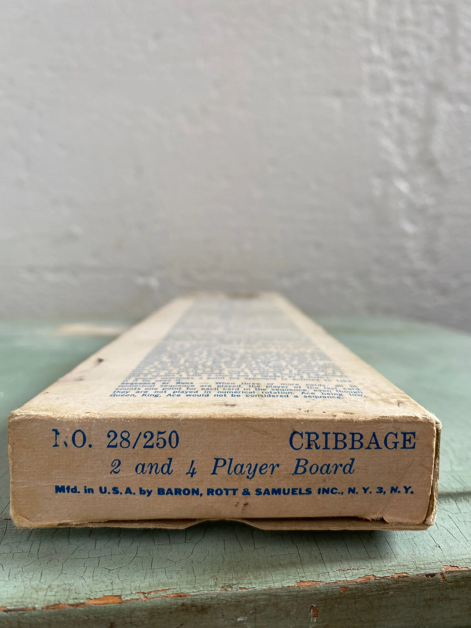 Vintage wooden cribbage board in its original box. For 2-4 players, this is a complete set. Wonderful gift idea!