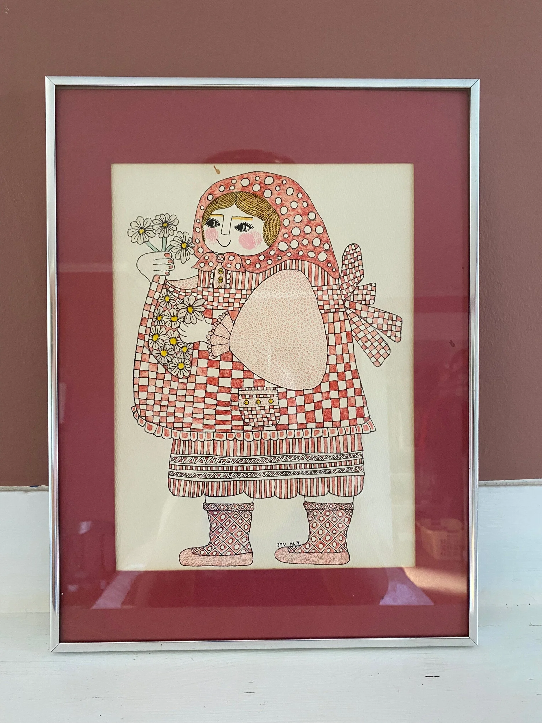 Jan Hur original - we believe acrylic on paper, as that is their typical medium. So beautiful! Varied pink, rose, yellow, and cream hues with black outline, depict a person in a checkered dress, holding daisies. Signed by the artist on the bottom right. Matted and framed.