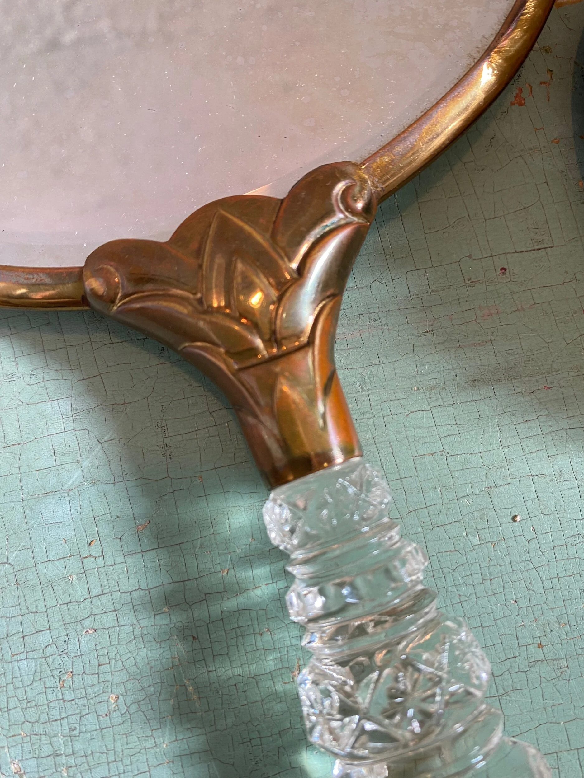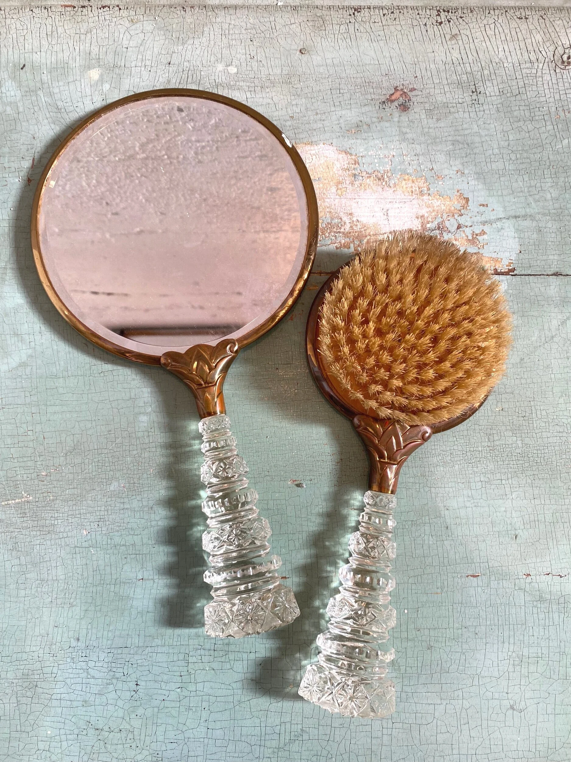Beautiful vanity mirror and brush set, with nouveau style detail. The handles are acrylic (perhaps lucite) and both pieces have a metal frame. The reverse side of both the brush and mirror are acrylic with a pretty canary yellow hue and starburst design. A beautiful set to use or display- wonderful gift idea!