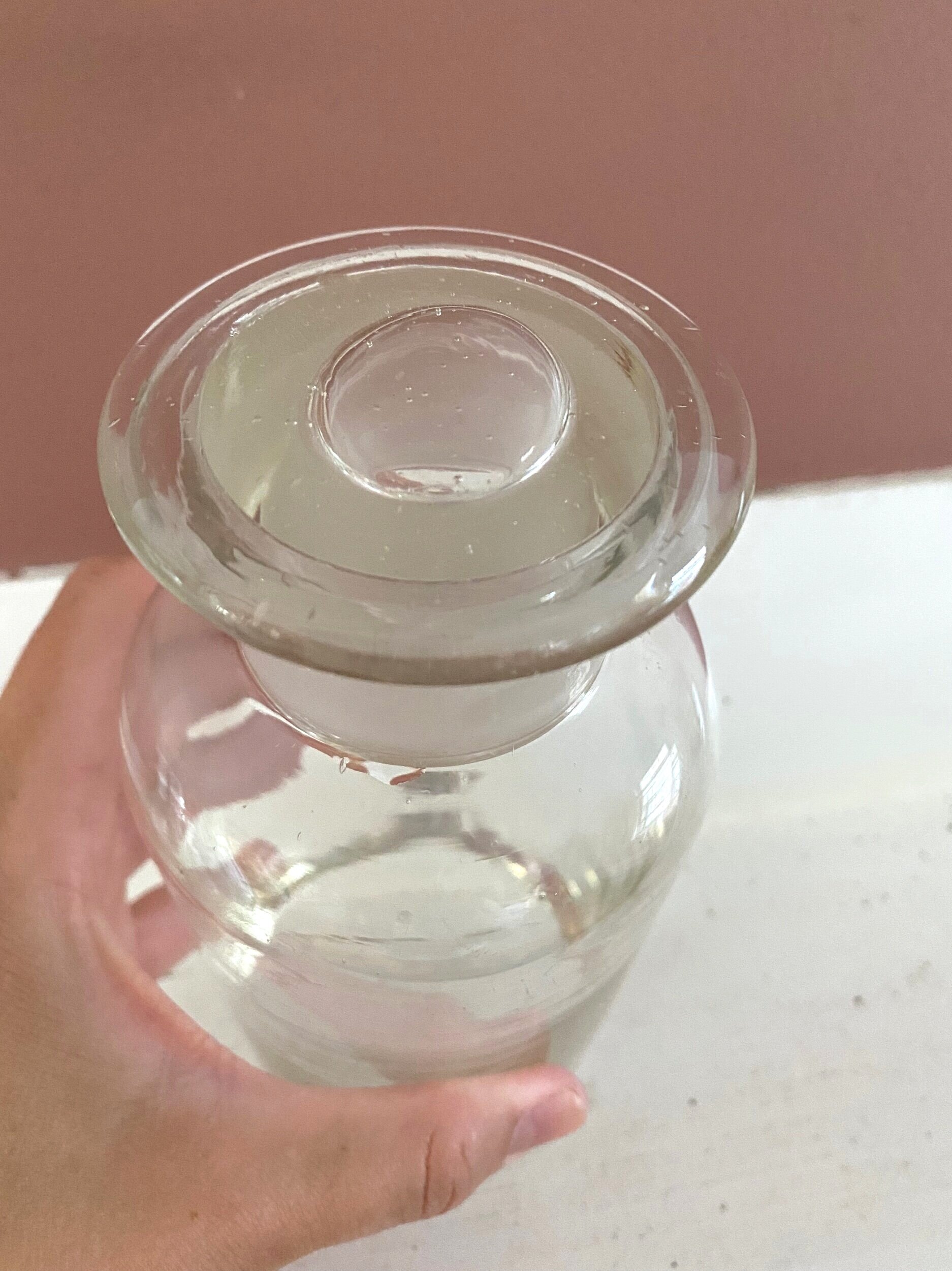 These beautiful apothecary bottles are in excellent vintage condition. The inside rim and stopper have the smoothest frosted glass; the rest of the bottle is thick, clear glass. These are SO versatile: use as a vase, for bathroom storage, or as a vessel for that homemade salad dressing. A beautiful and classic design, which is why these are getting harder and harder to find out in the “wild.”