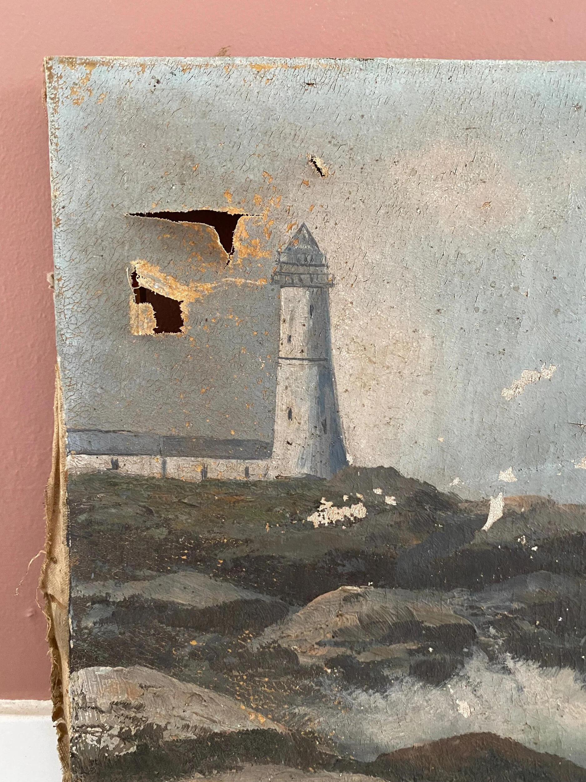 Weathered Original Oil on Canvas: Lighthouse Along a Rocky Coast (unsigned)