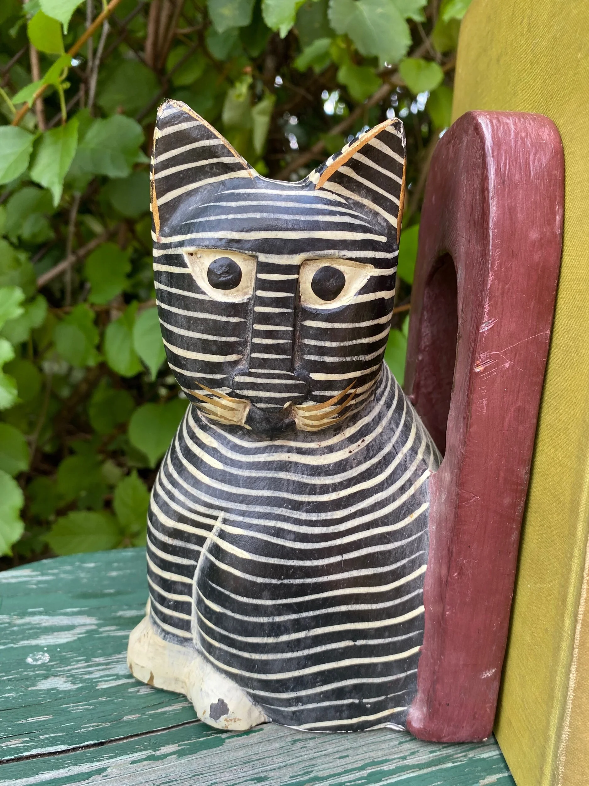 We love the folk-artsy vibe on this puuuuurfect set of cat bookends. Each bookend is original; the cats look similar but not exactly the same. The cats are black and white striped and the bookend “backs” are a light maroon color. Price includes the set.