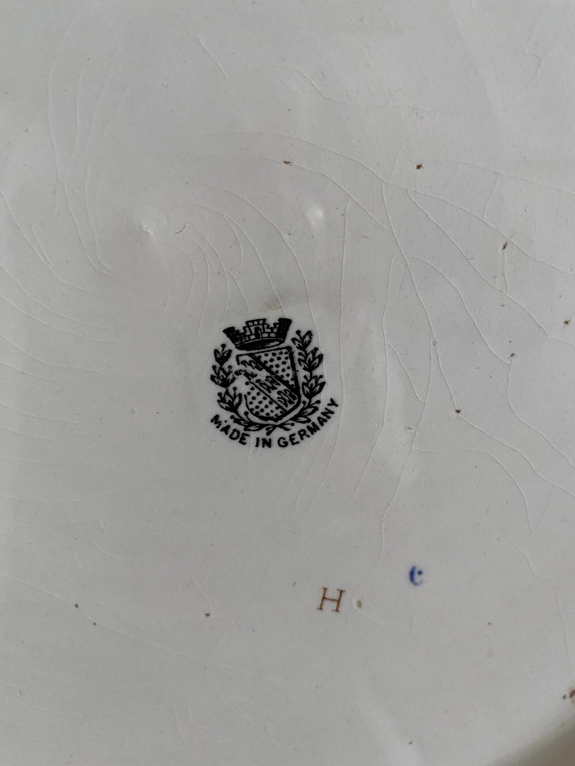 Large antique stoneware serving bowl with handpainted depictions of nursery rhymes (we think…doesn’t that look like Mother Goose and Little Bo Peep, though?). This would make a beautiful centerpiece, a one-of-a-kind baby shower gift, or a conversation piece at your next family-style dinner party. Signed on the bottom: Made in Germany, along with an “H.” Excellent vintage condition from the early 1900’s. Fun fact: it belonged to our great-aunt!