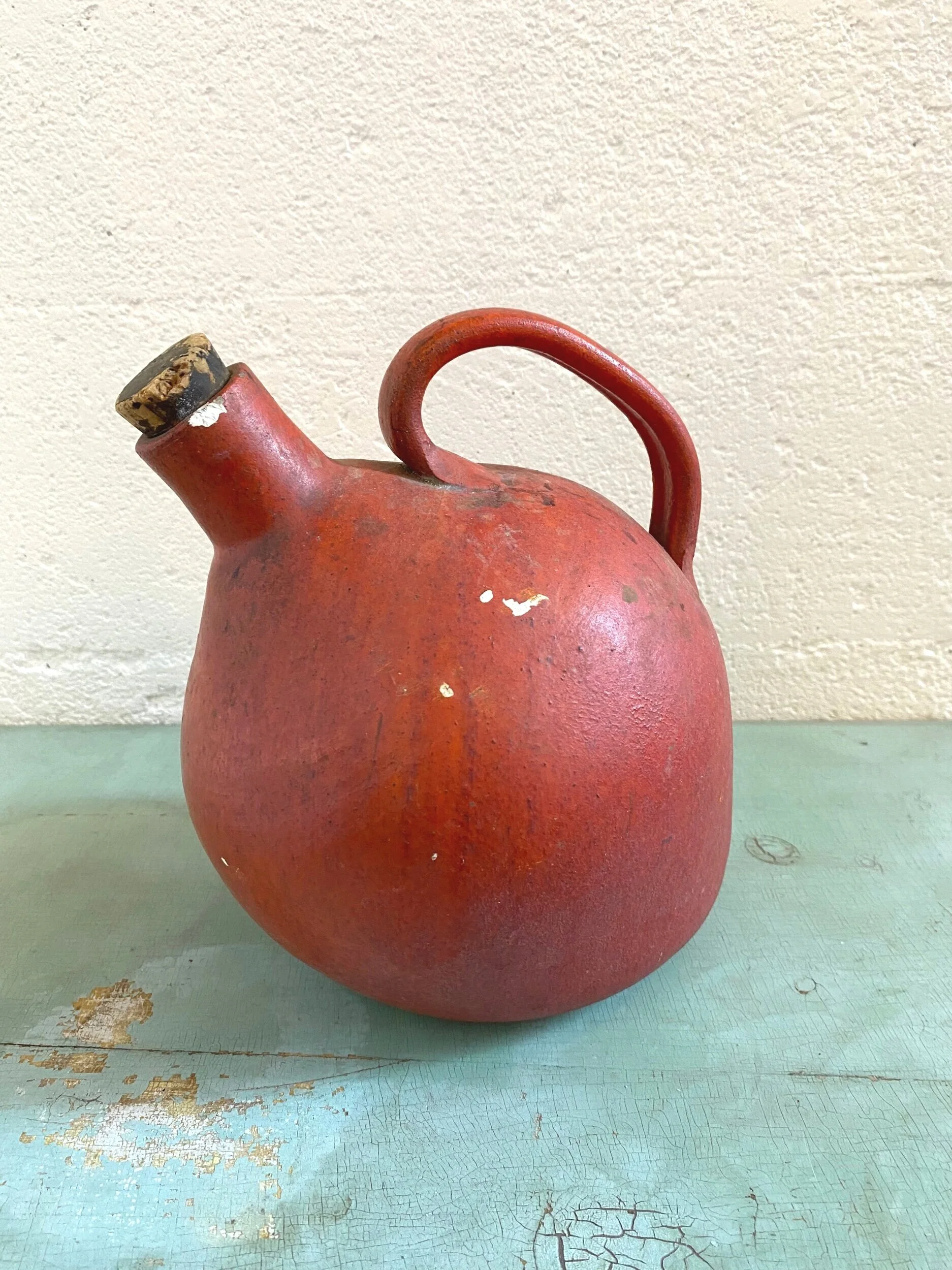 Pleasantly distressed antique stoneware jug with removable cork stopper. Beautiful crimson red color with orange undertones. The base is flat and the jug slightly slanted- perfect for sitting atop a shelf, stack of coffee table books, or using as a bud vase. Some shallow chips and peeling paint, as pictured.