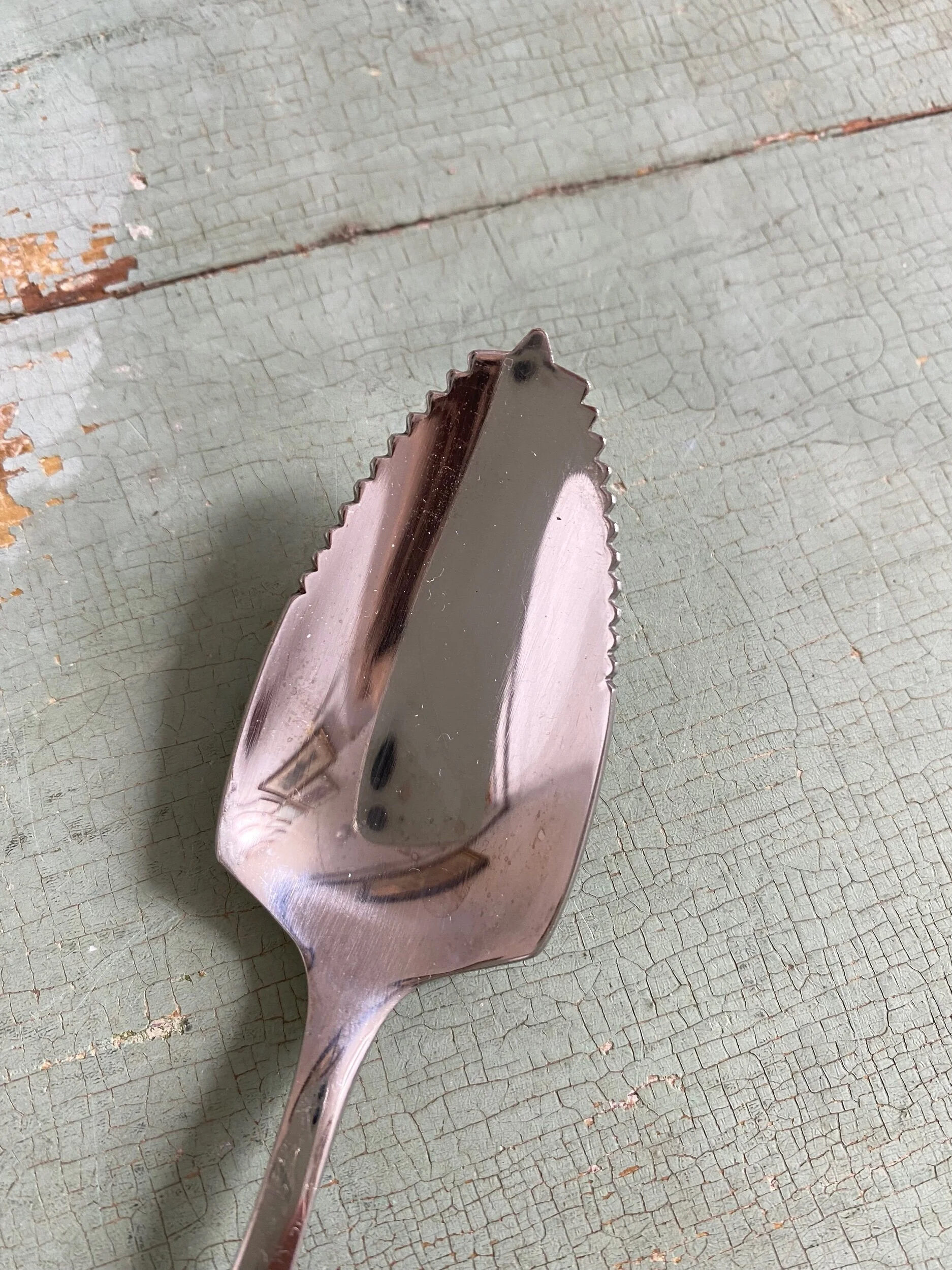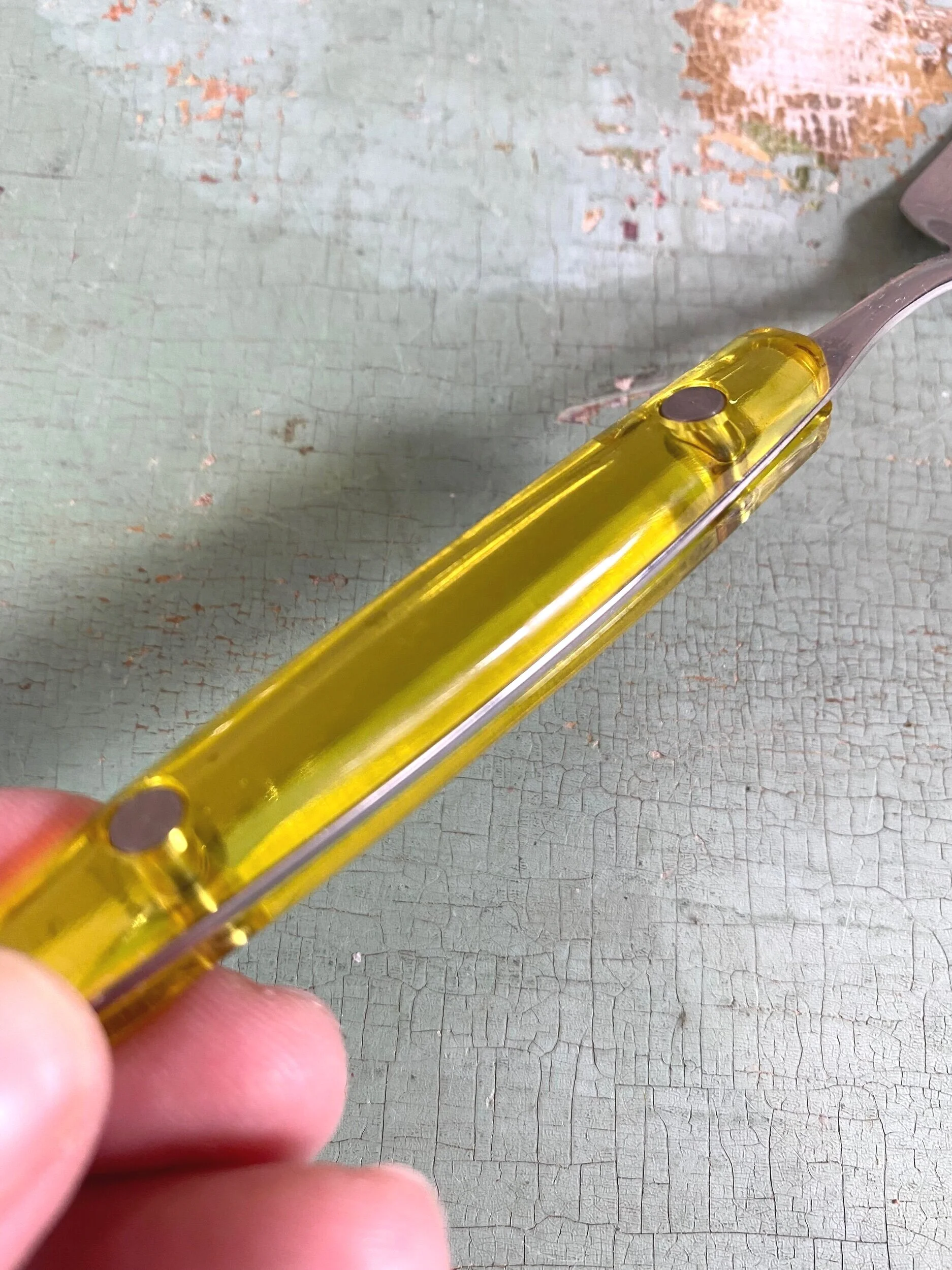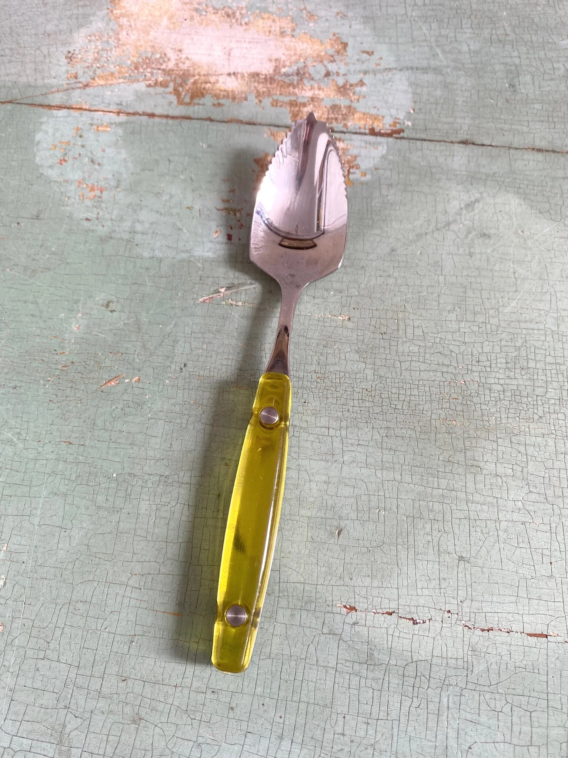 Set of 6 stainless steel grapefruit spoons with yellow acrylic/lucite handles and serrated edge. Super sturdy feel and in excellent vintage condition, with minimal signs of previous use.