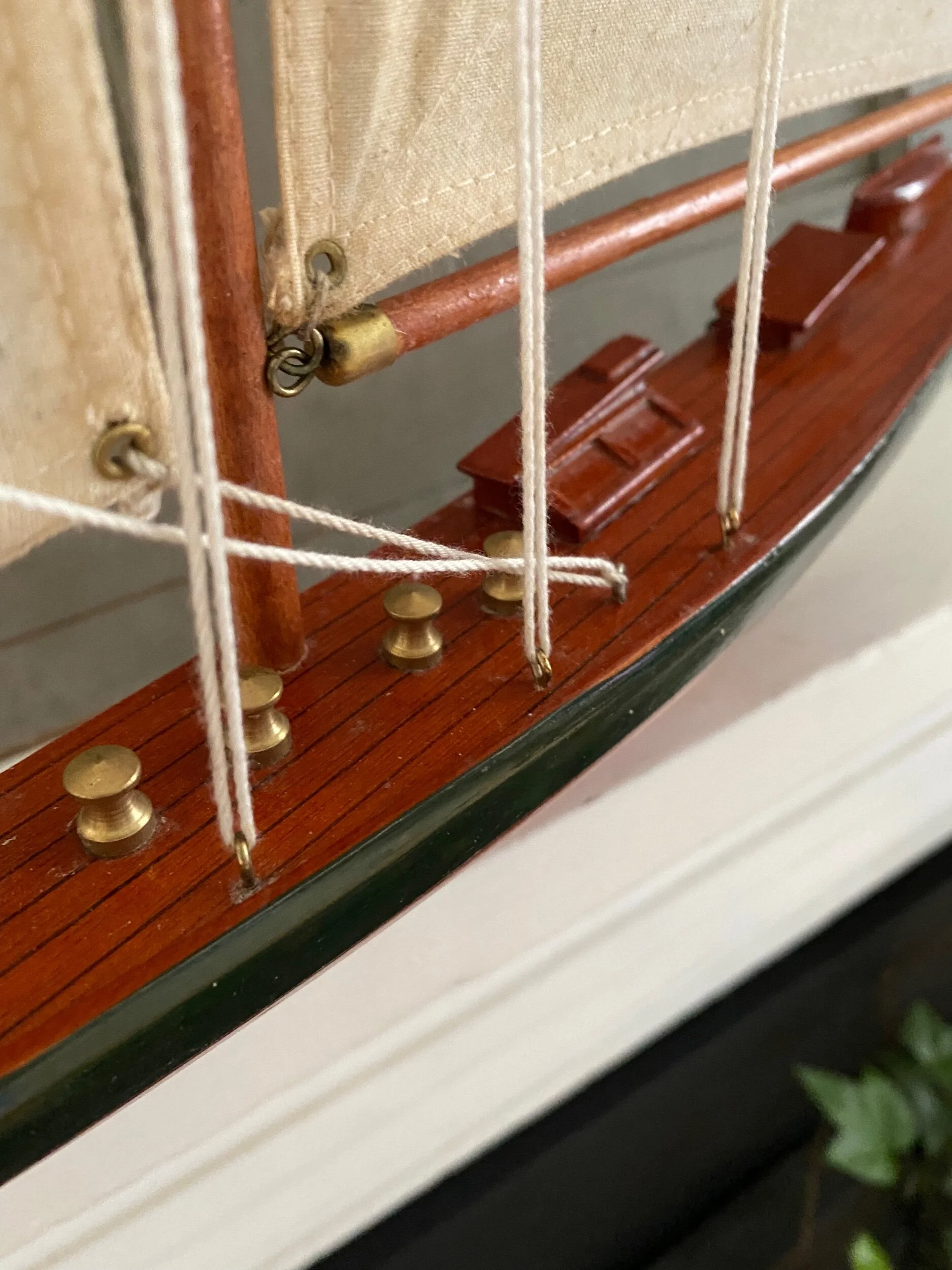 Vintage model sailboat with wall mounts. The detail on the “deck” is so cool! Brass hardware throughout on the ship and the rigging. There is some staining on the sails, as pictured, which we have not attempted to clean. We envision this above a mantle, in a cool seafood spot, a beach house, or anywhere! Also a cool gift idea for that sailor in your life :)