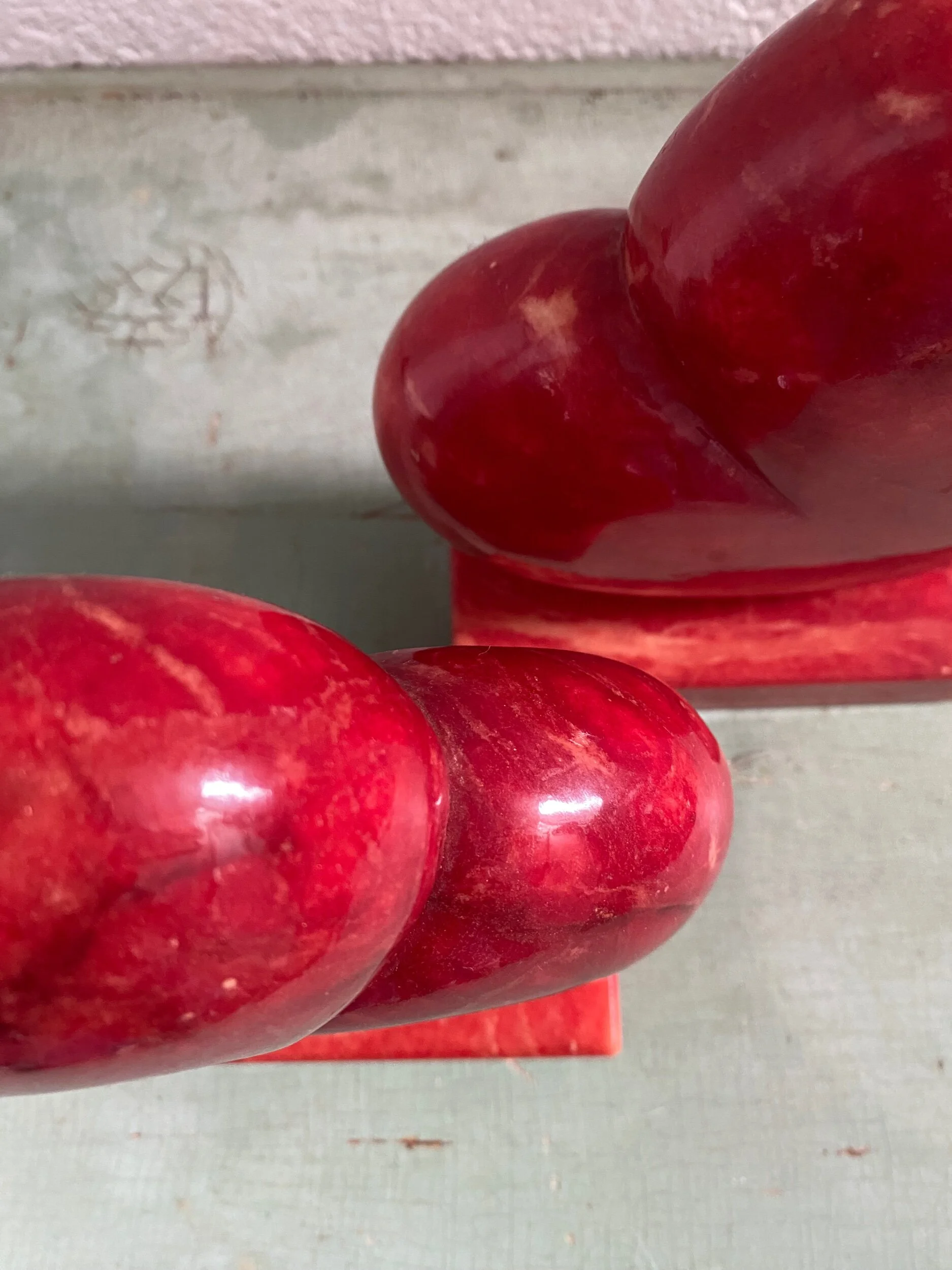 Set of 2 vintage Volterra alabaster heart-shaped bookends, made by Ducceschi of Italy. It’s rare to find these period, let alone in such pristine condition. These bookends can be positioned in multiple ways. The interior side of the heart is flat, so books will fit flat and snug in between. Or, configure as shown with the hearts “open.” These also just look great as a sculptural piece. Signed on base.