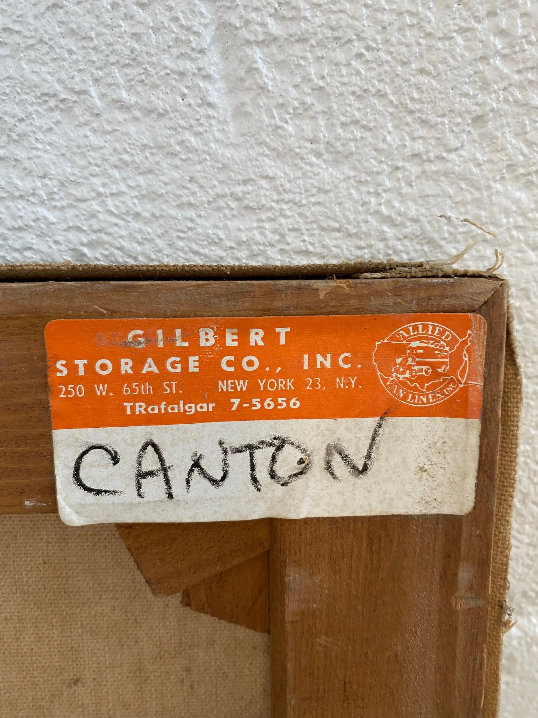 Original oil painting on stretched canvas depicting what looks like a “slice” of a downtown/city neighborhood featuring interestingly shaped and hued buildings. Perhaps that is a mosque or other elegant building in the background? Unsigned. Given the style of the wood frame and aged-look around the corners on the canvas, we are placing this as midcentury, possibly earlier. On the back is a sticker from a storage/moving company in NYC, along with what we assume is a last name, “Canton.”