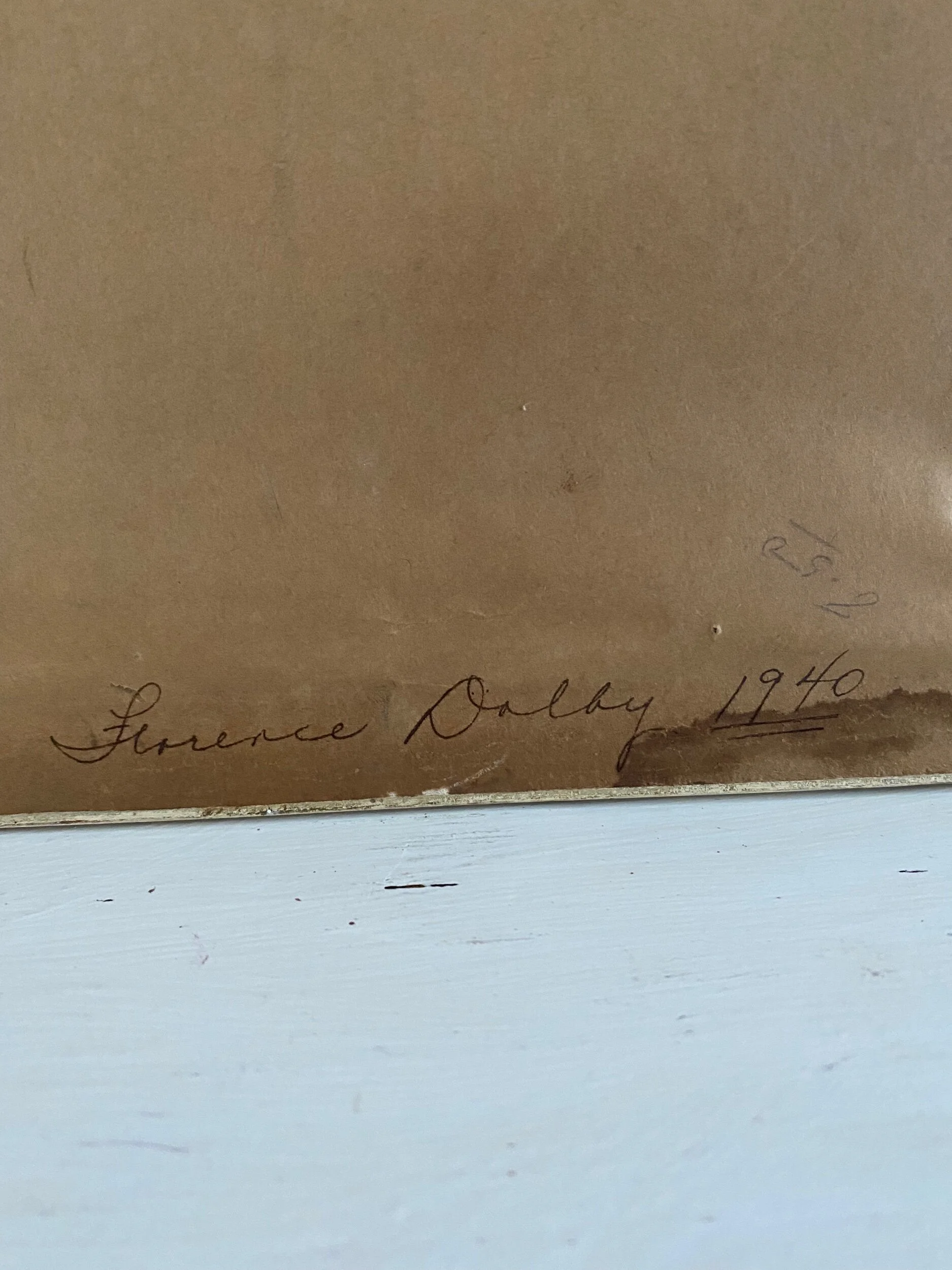 A visually stunning still-life with dogwoods in glazed pottery by Florence Dalby, signed on the back, 1940. We believe this to be a print. It’s preserved in a pretty wood frame- white with gold detail. Amazing condition for its age and very unique.