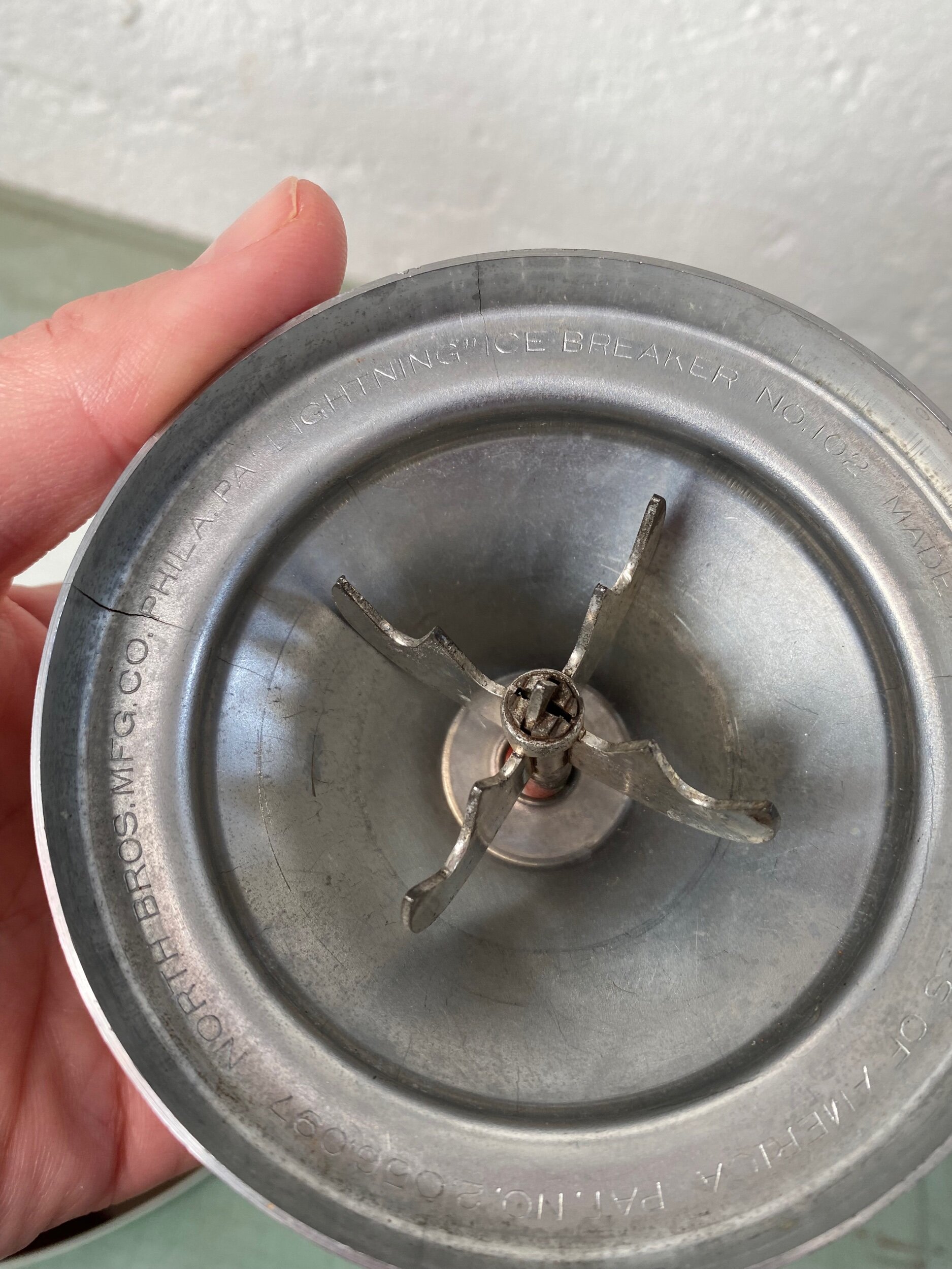 Midcentury cocktail shaker/mixer with drink recipes and the “Lightening Ice Breaker” attachment- a rare find! Use the handle to move the ice crusher up and down. Some rust on the top handle, as pictured. The glass shaker is in excellent vintage condition. “Lightening Ice Breaker” along with the manufacturer (North Brothers of Philadelphia, PA) and patent number.