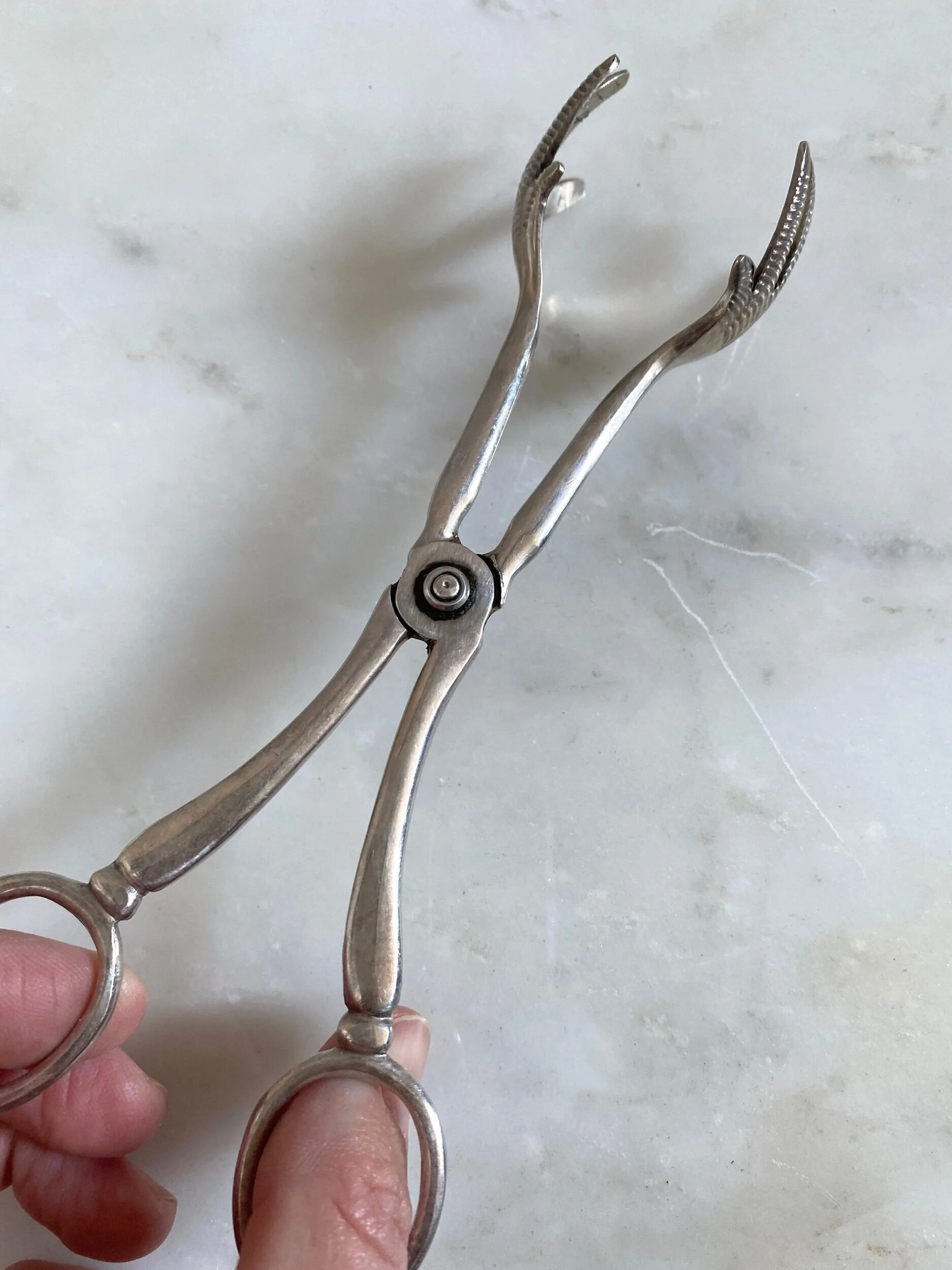 Silver-plated scissor tongs with “chicken claw” design on the tips. Made by Sheffield of London and signed, along with maker’s mark. Great vintage condition with some expected wear. Fully functional.