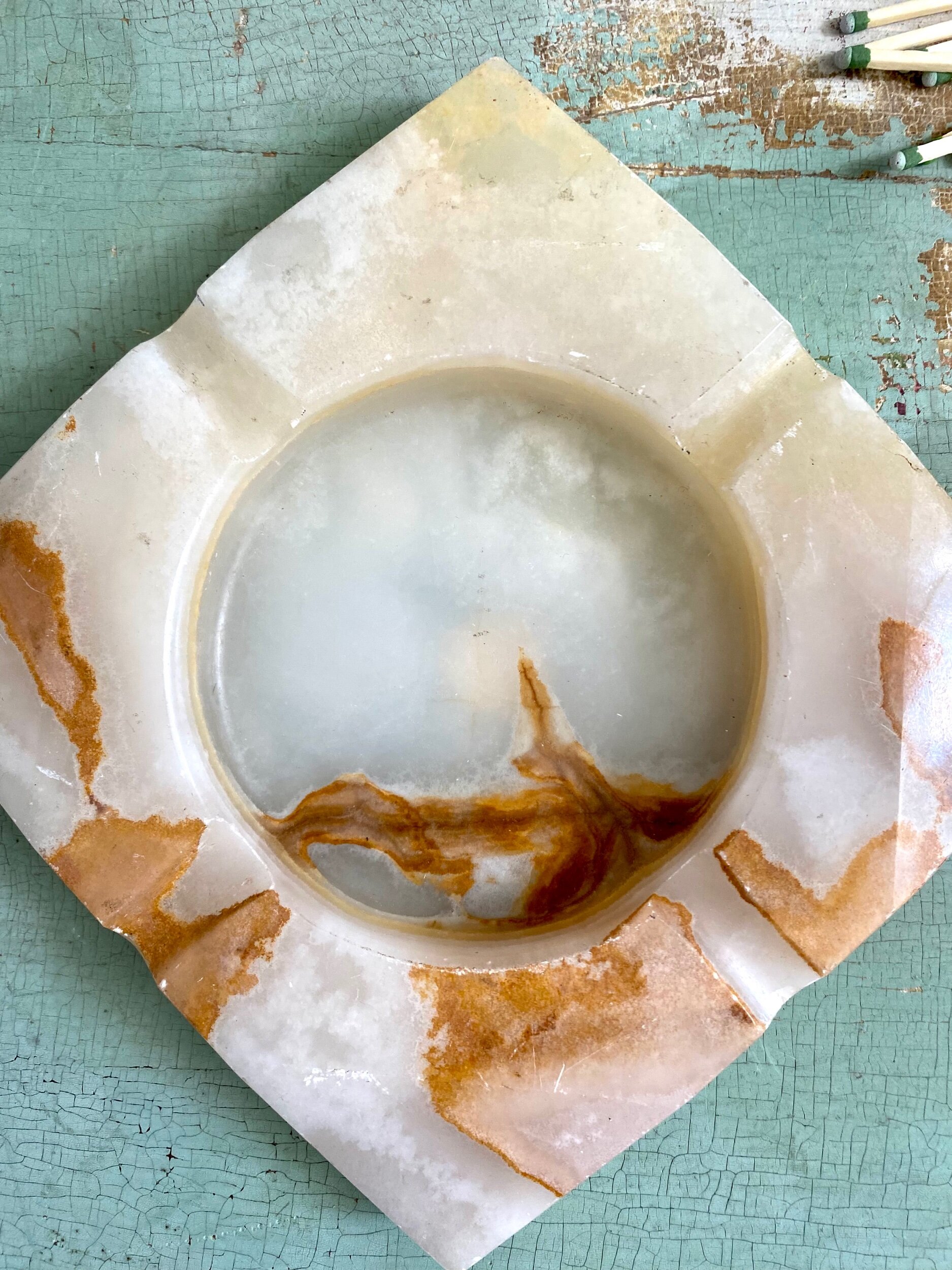 Beautiful cream and caramel-hued onyx ashtray. Great vintage condition with no apparent chips.
