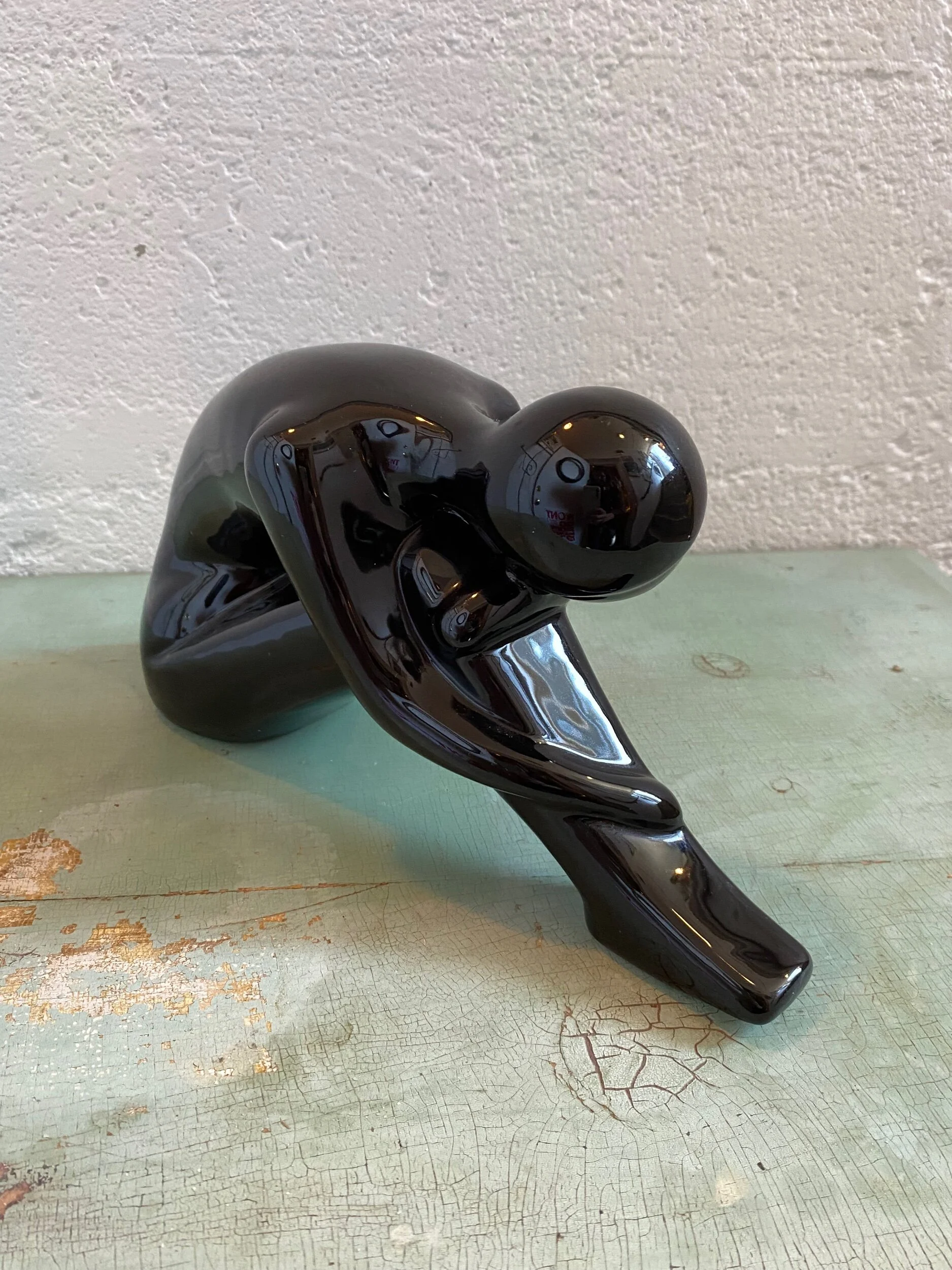 This sleek art nouveau-style sculpture, in the form of a human sitting and kneeling over their legs as if in thought, is in excellent vintage condition. This is a ceramic piece with a shiny black glaze. Attributed to the 1960’s/70’s but it is unsigned.