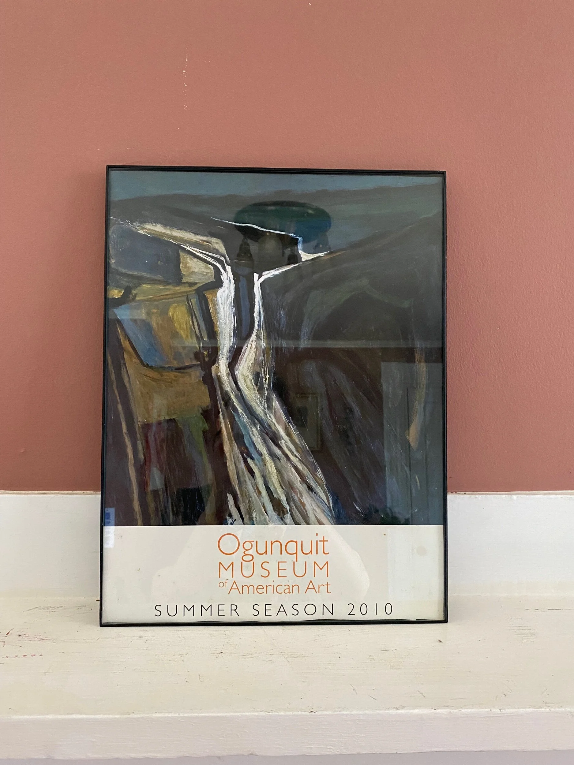 Framed promotional poster for Ogunquit Museum of American Art, located in Ogunquit, Maine. This is from their “summer season” in 2010. We are unsure about the artist, but it appears to depict the craggy, rocky Maine coast in an abstract form.