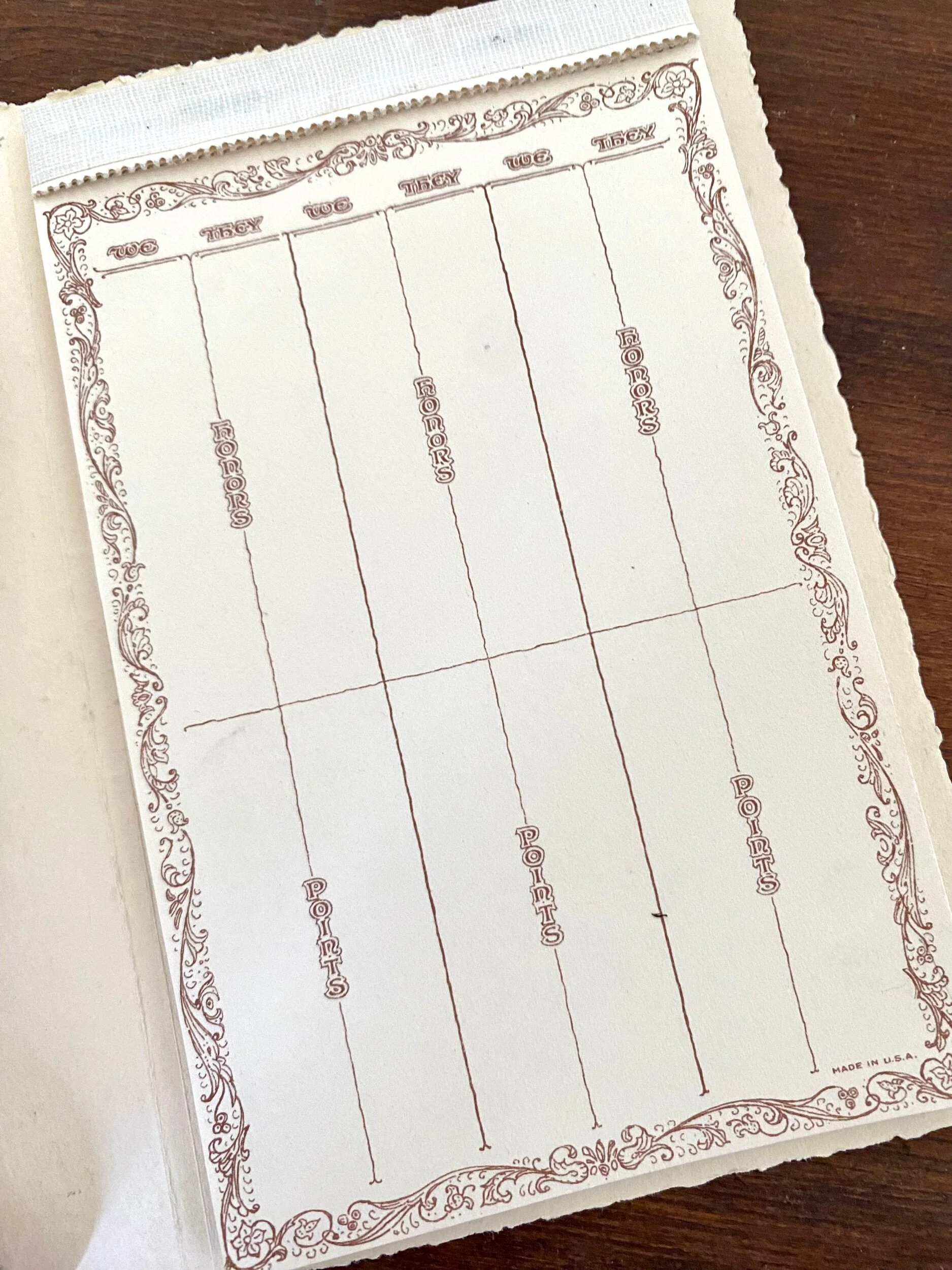 Stunningly ornate bridge score card and tally set, from the 1940’s. Includes original box, 3 score pads (for tables) and 4 tallies (some are missing). Excellent condition. These really feel like art pieces and would make a wonderful gift idea.