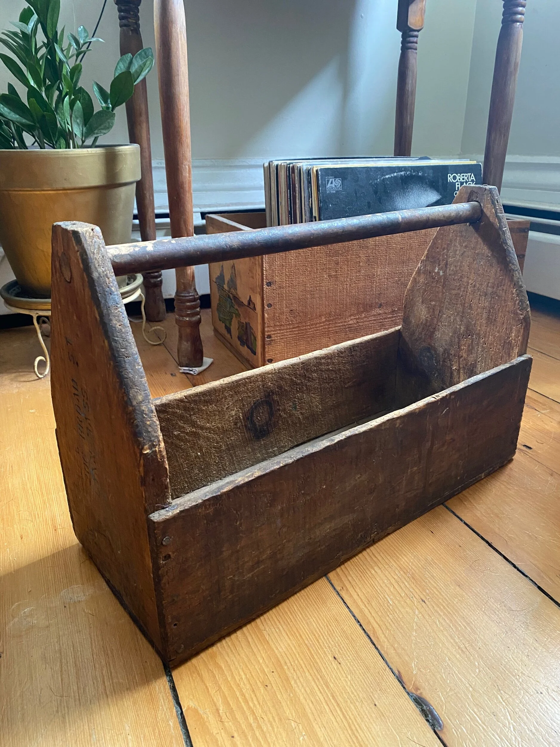 Antique wood tool box. Signed, “206 Broad Street, Lynn, Mass.” This was formerly the “Tapley Building,” built in 1890, and currently on the National Register of Historic Places. Sadly, the building burned down in 1999. Such a cool decor piece! We also love it for holding potted plants.
