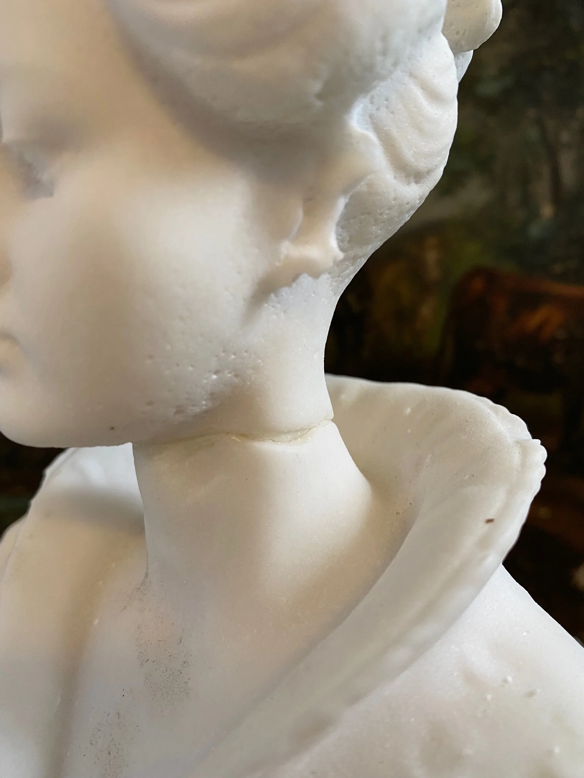 Elegant bust of a woman with a medici style collar and hair up in an elaborate bun. This is attributed to Arnoldo Giannelli (1960’s) but is not signed. These factory-manufactured busts were typically made of recomposed stone, usually a mix of alabaster, marble powder, and resin. Beautiful raised detail on the jacket and her hair. There is repair, as pictured, around the full length of her neck and damage on the left-side ear. This is reflected in price. A beautiful piece!