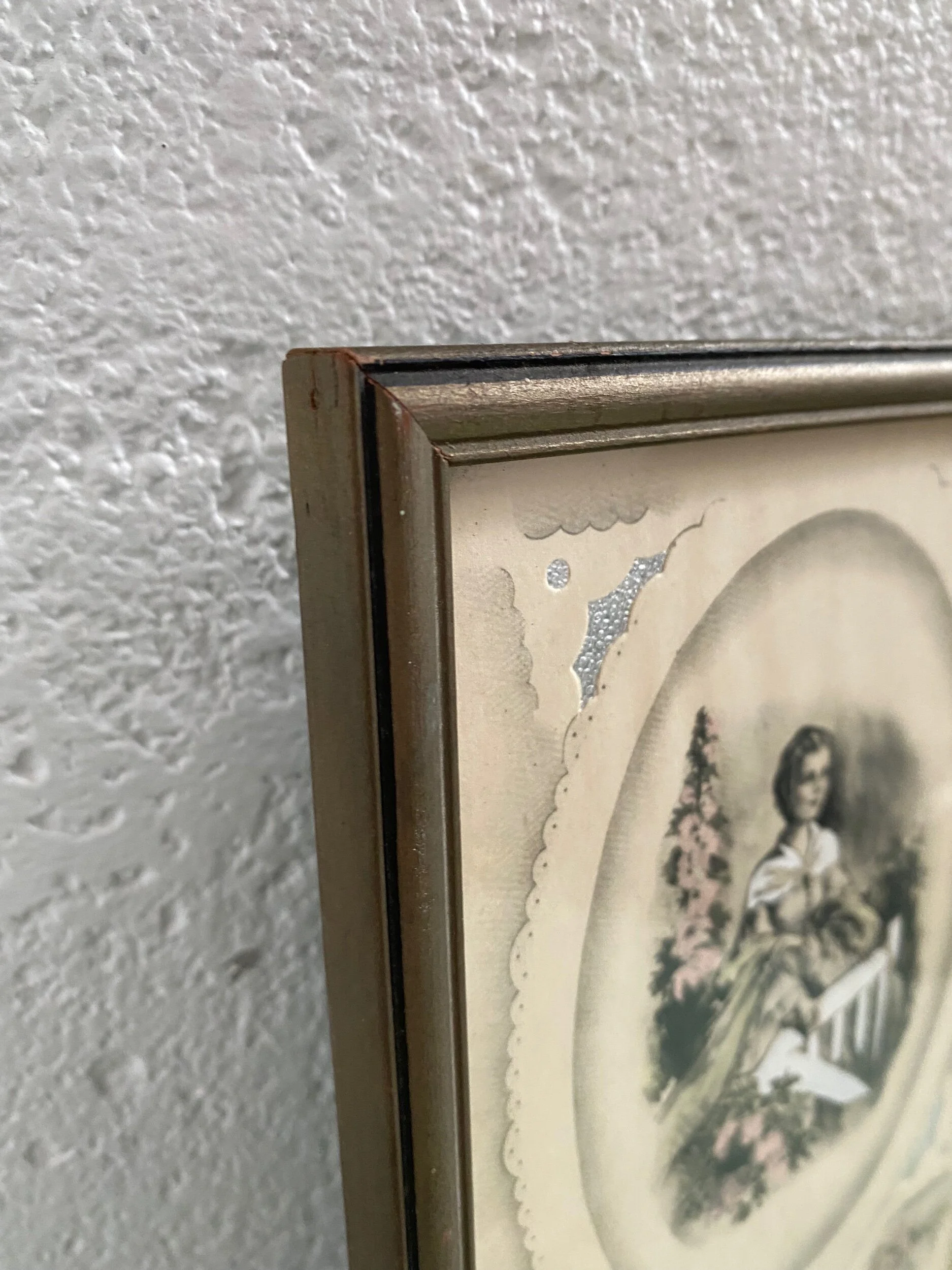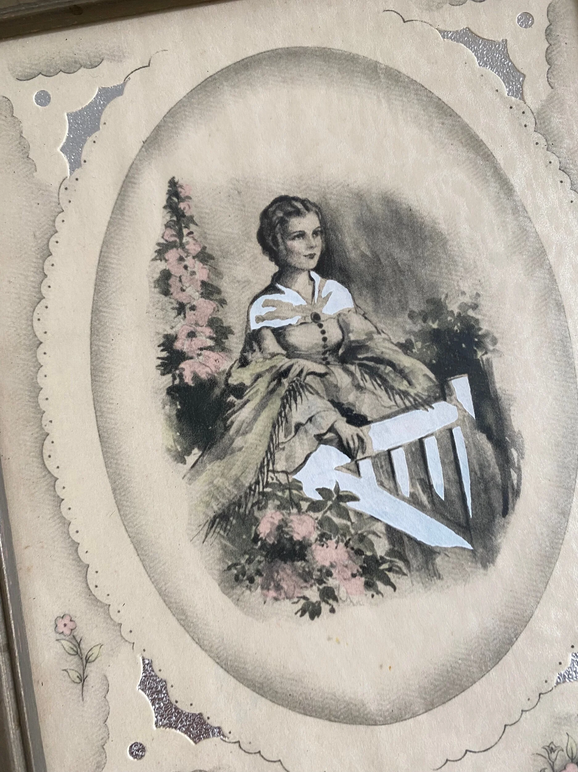 Framed poem, “Mother Dear” by Maurine Hathaway along with an illustration of a woman in Victorian-style dress in front of a white picket fence, surrounded by pink roses. The illustration is adorned by pockets of shimmery metallic silver. Sold in the 1930’s, it is rare to find a Buzza Motto in such pristine condition, with the original signed hanger and manufacturer’s sticker still in the reverse. This would make a wonderful gift idea for that special mom in your life.