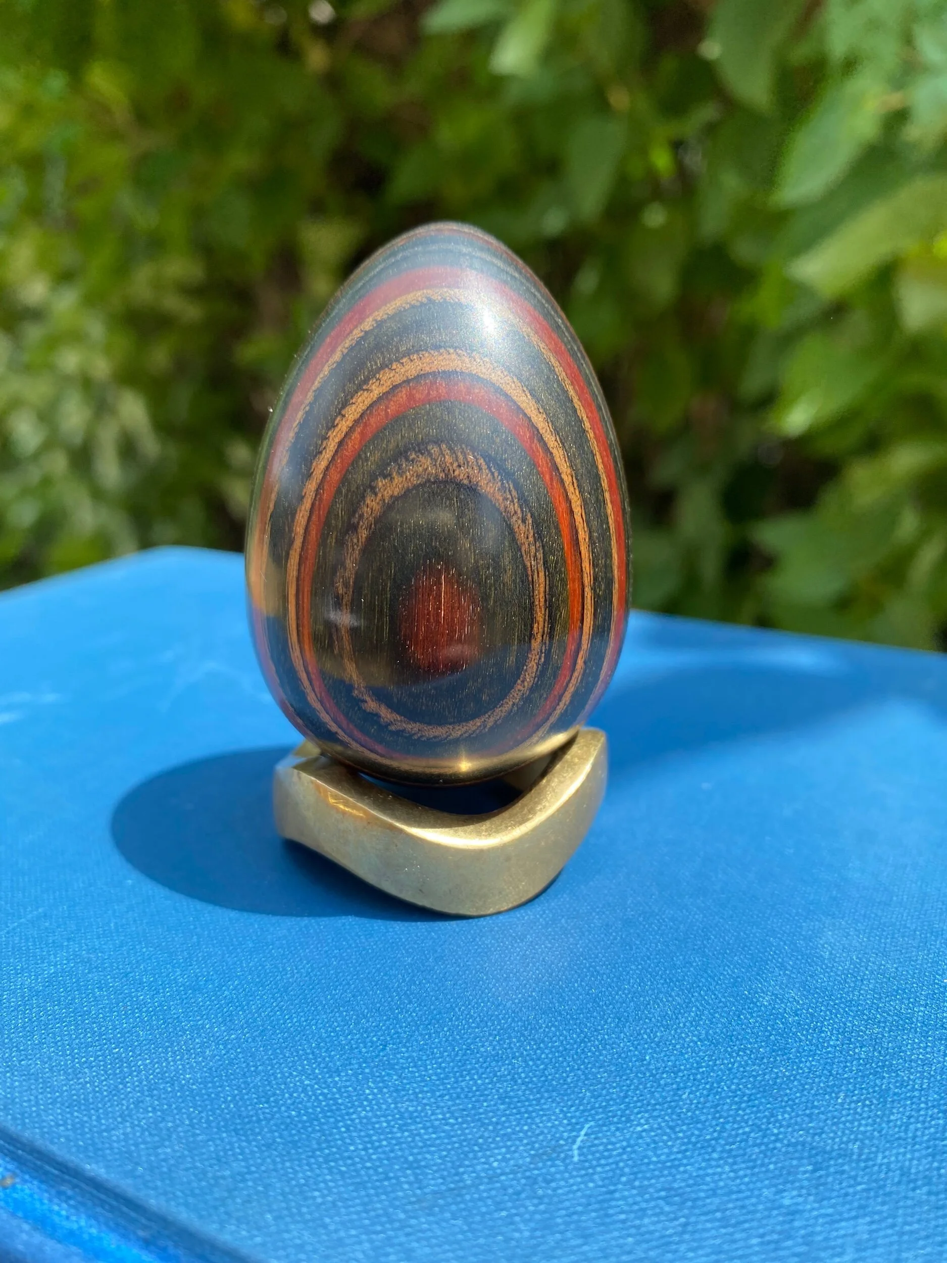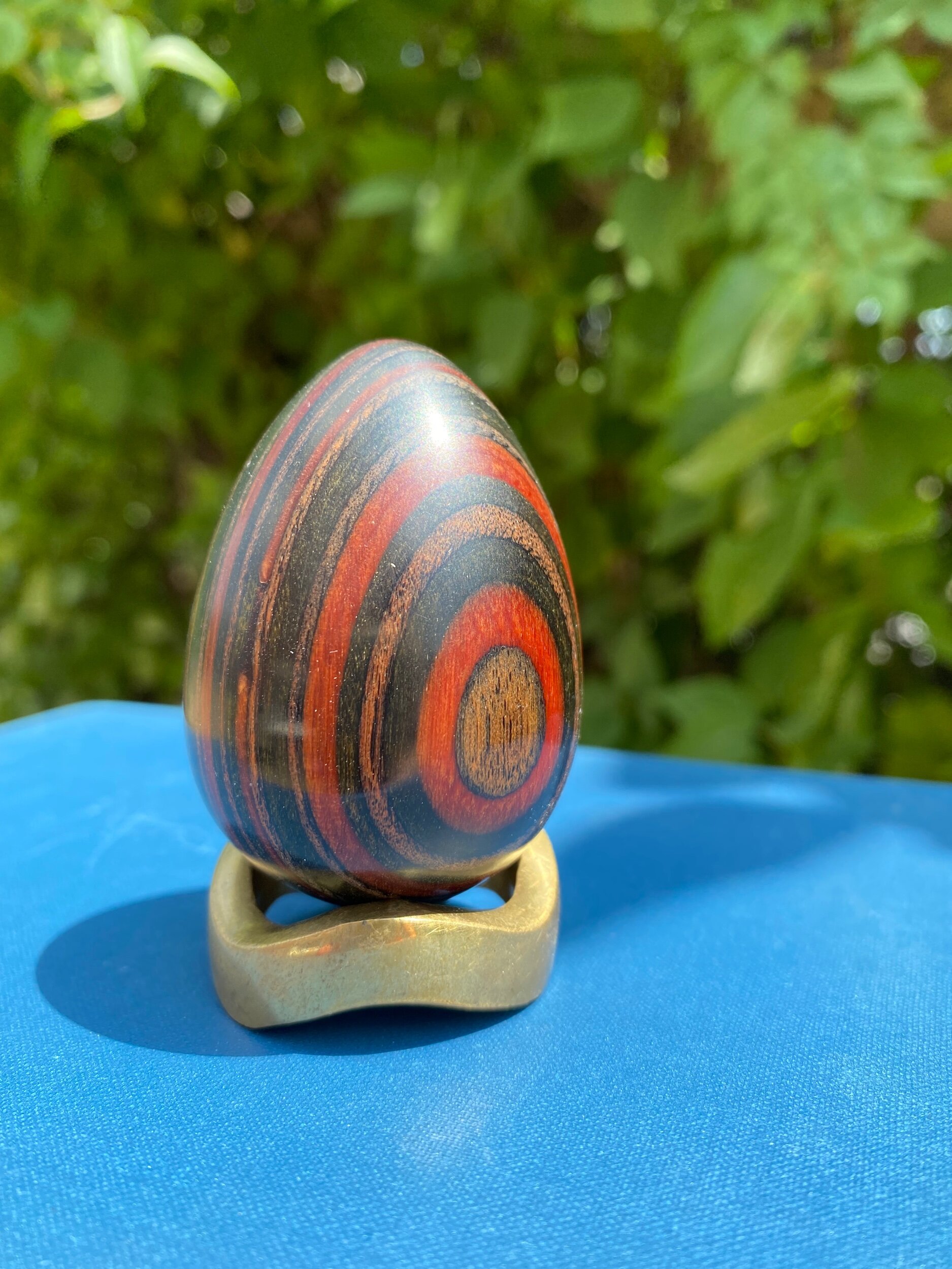 Check out this beautiful wooden egg! Smooth concentric circles in red, marigold, green and dark brown. Price includes the egg and a brass ring stand to display it. Very MCM, very cool.