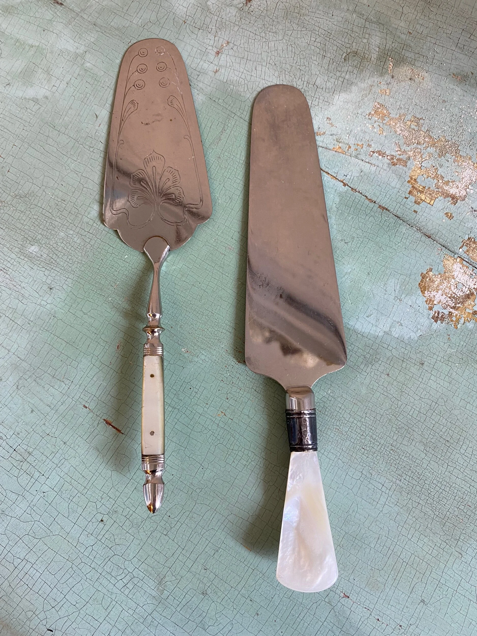 These Victorian-era cake servers with mother-of-pearl handles are absolutely gorgeous. Either would make a wonderful gift for someone who is getting married (to use for cake at the wedding!) or for a host or house-warming. Both are in great condition for their age. There is no stamp, number, or maker’s mark on either, however we are guessing that these are silver-plated.