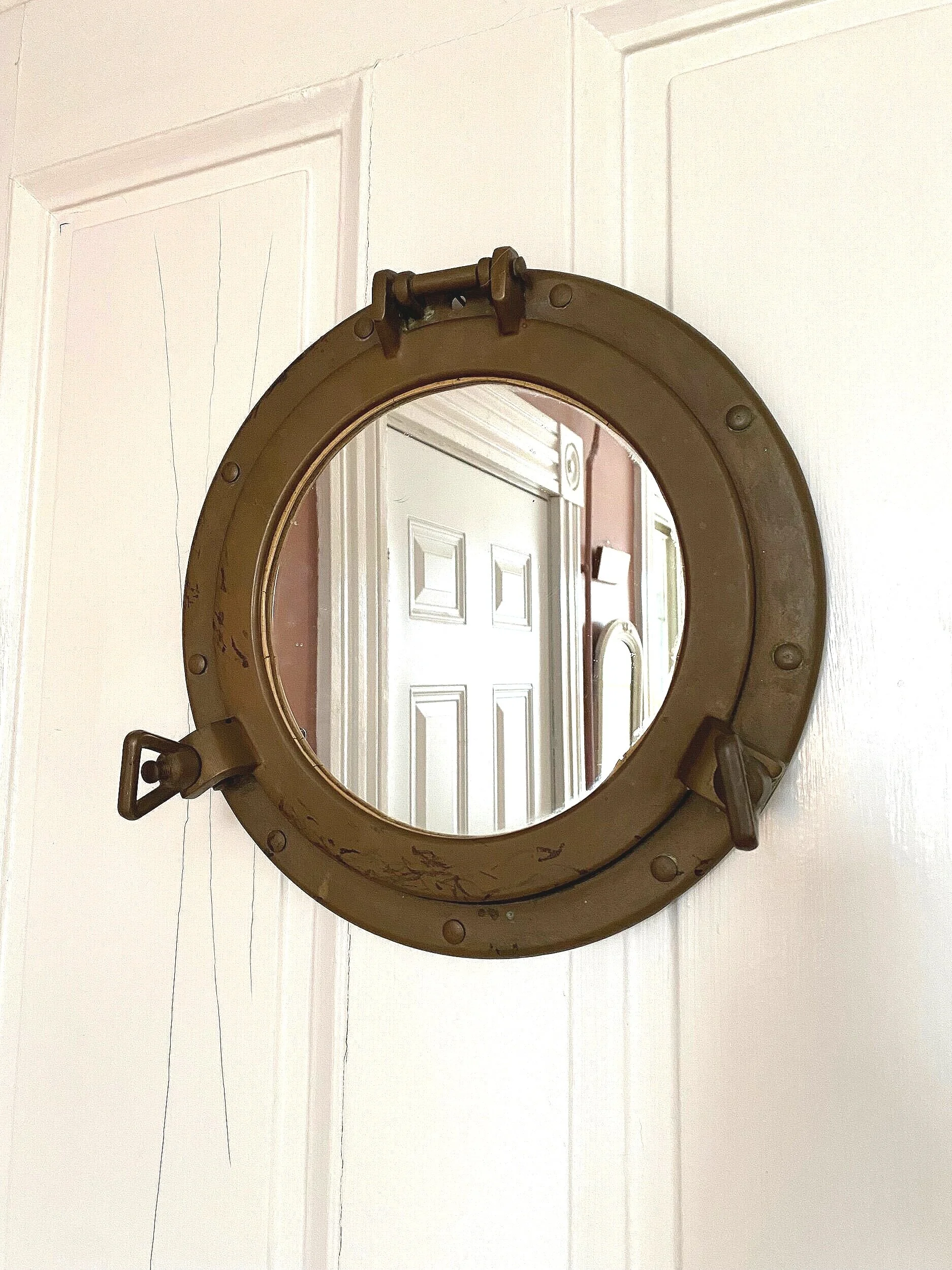 Brass “porthole” with mirror in the center and decorative latches. There is a hole on the rim for hanging. Great patina as-is but this piece could also be polished-up, if that is your preference. Some breakage in the lining between the brass frame and mirror, as pictured, however it does not appear to impact the structural integrity of the piece.