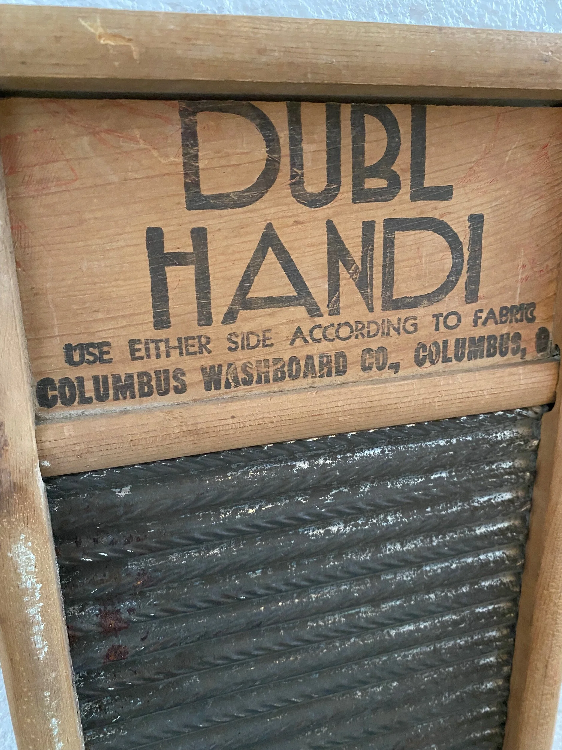 We love these as wall decor! This vintage “Dubl Handi” washboard, manufactured by Columbus Washboard of Columbus, Ohio, was designed for hand washing delicates pre-gentle cycle. It’s in great vintage condition, with nice patina on the ribbed metal board. On the back reads: Ideal for silks, hosiery, and lingerie, or handkerchiefs. Just the right size to fit a bucket pail or lavatory. Packs easily in suitcase or traveling bag.”
