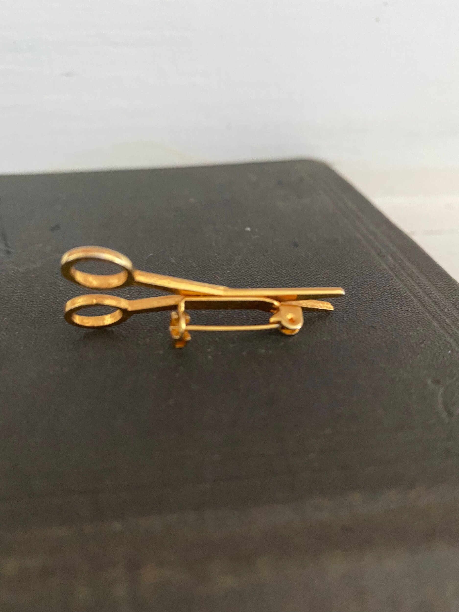 Sweet gold metal pin/brooch in the shape of open scissors/shears. It’s a quality piece (not flimsy) and is in excellent condition, with a fully functional clasp/pin. Signed in very small letters is: Hong Kong.