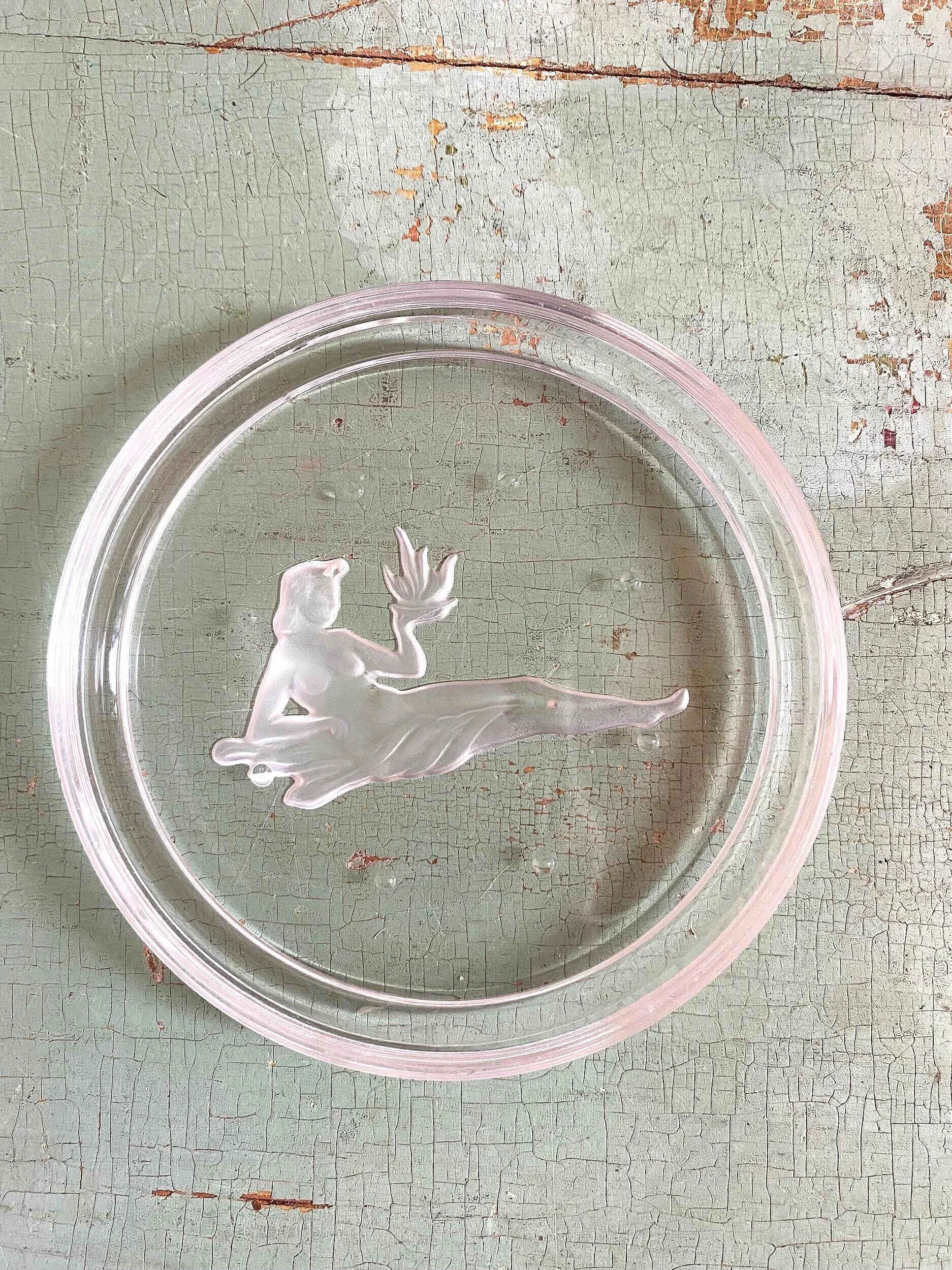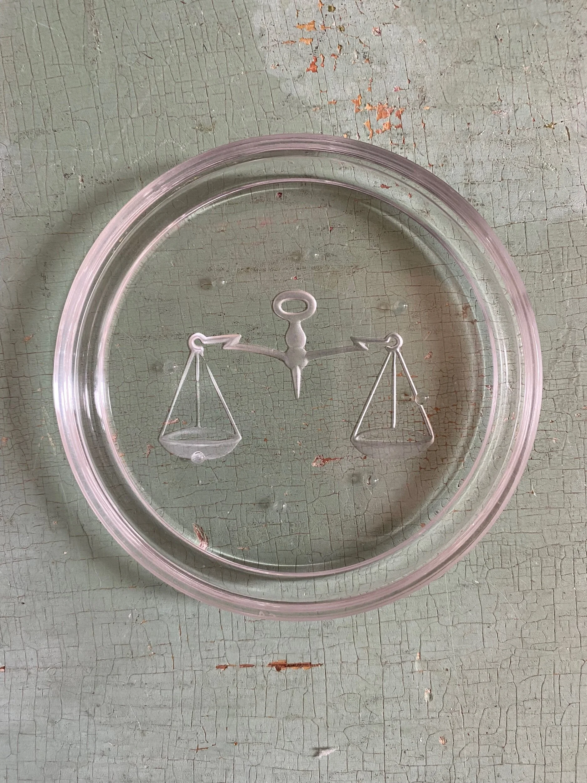 Vintage crystal coaster with sign of the zodiac. Made by Val St. Lambert of Belgium in the 1970’s. These were also sold at Tiffany and Co. back in the day. Each coaster has a reverse embossed (intaglio) zodiac sign/symbol. There are small raised nubs on the top to allow condensation to drip off of a glass. Sold individually. Excellent vintage condition with some expected signs of use (light scratching, etc). The “Cancer” coaster has more significant wear and is priced to reflect that.