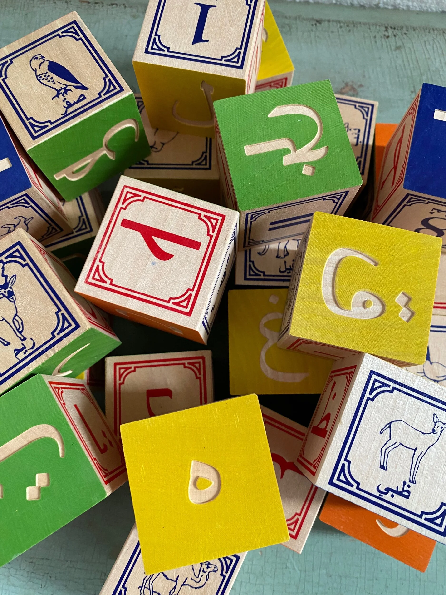 Set of carved wooden Arabic alphabet blocks with animals, numbers and letters. Mint condition and contemporary. A full set of 28 blocks.