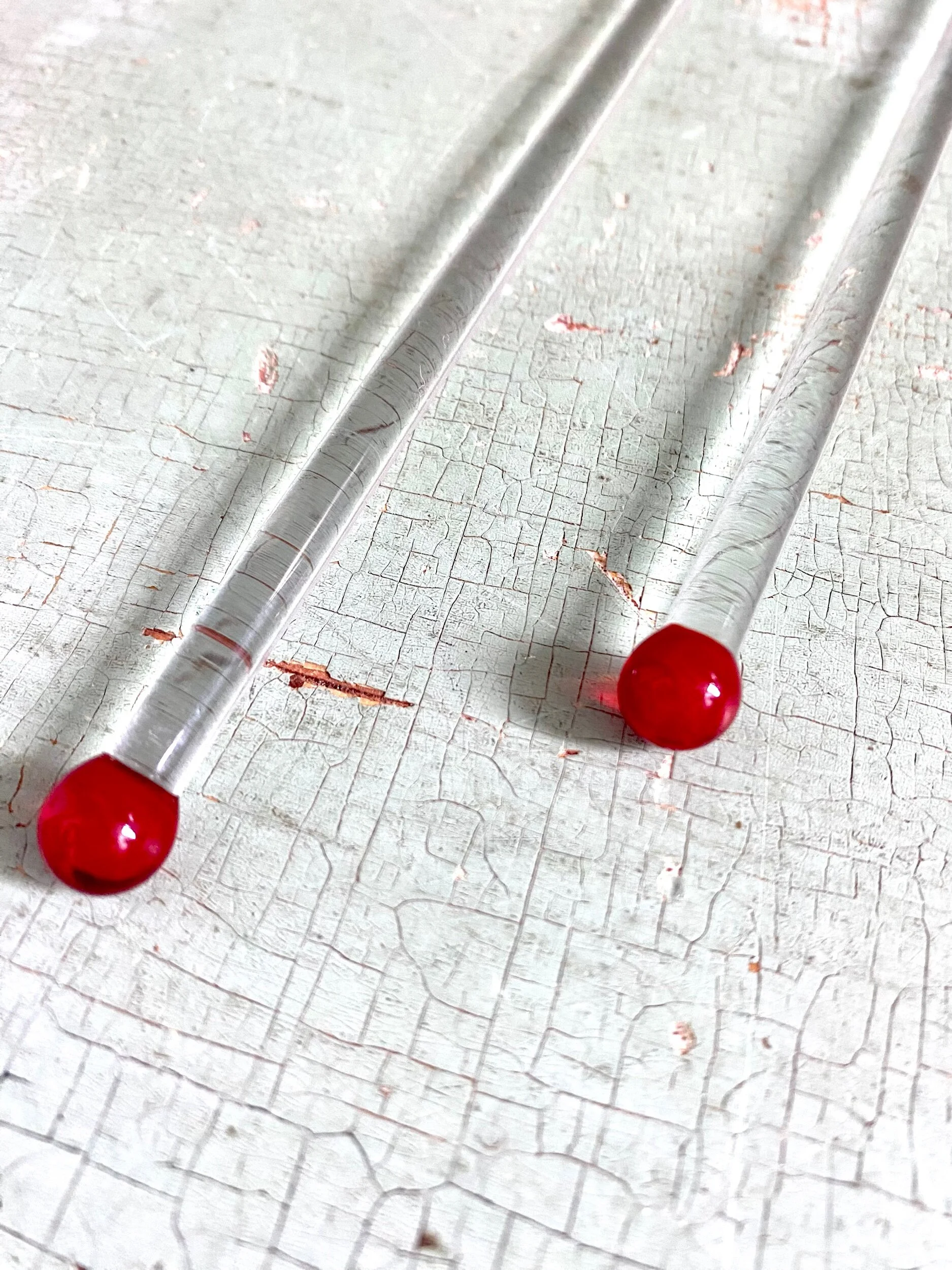 Set of two high-quality glass cocktail stirrers. Red hearts adorn the top and red balls on the base. Excellent condition. Great gift idea!
